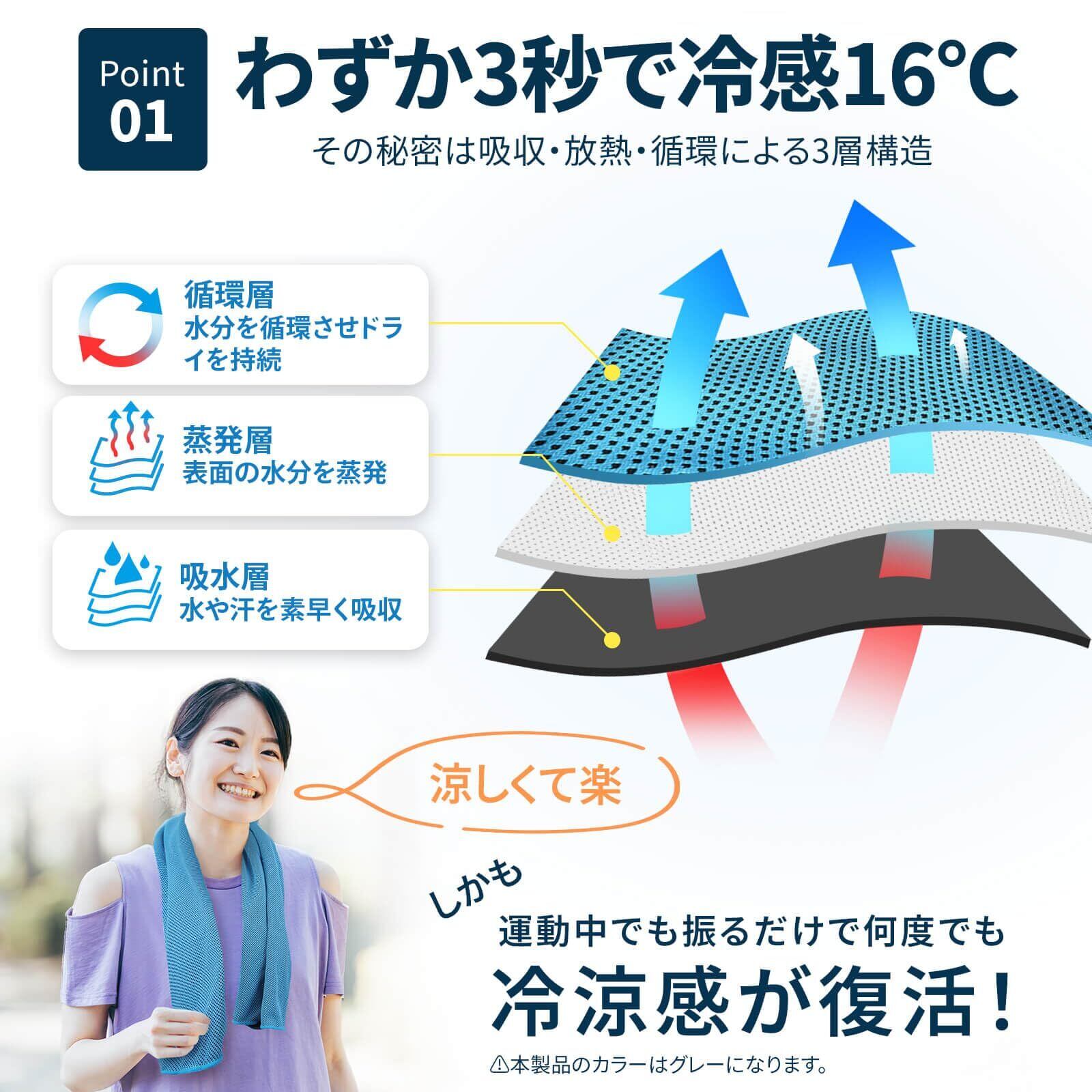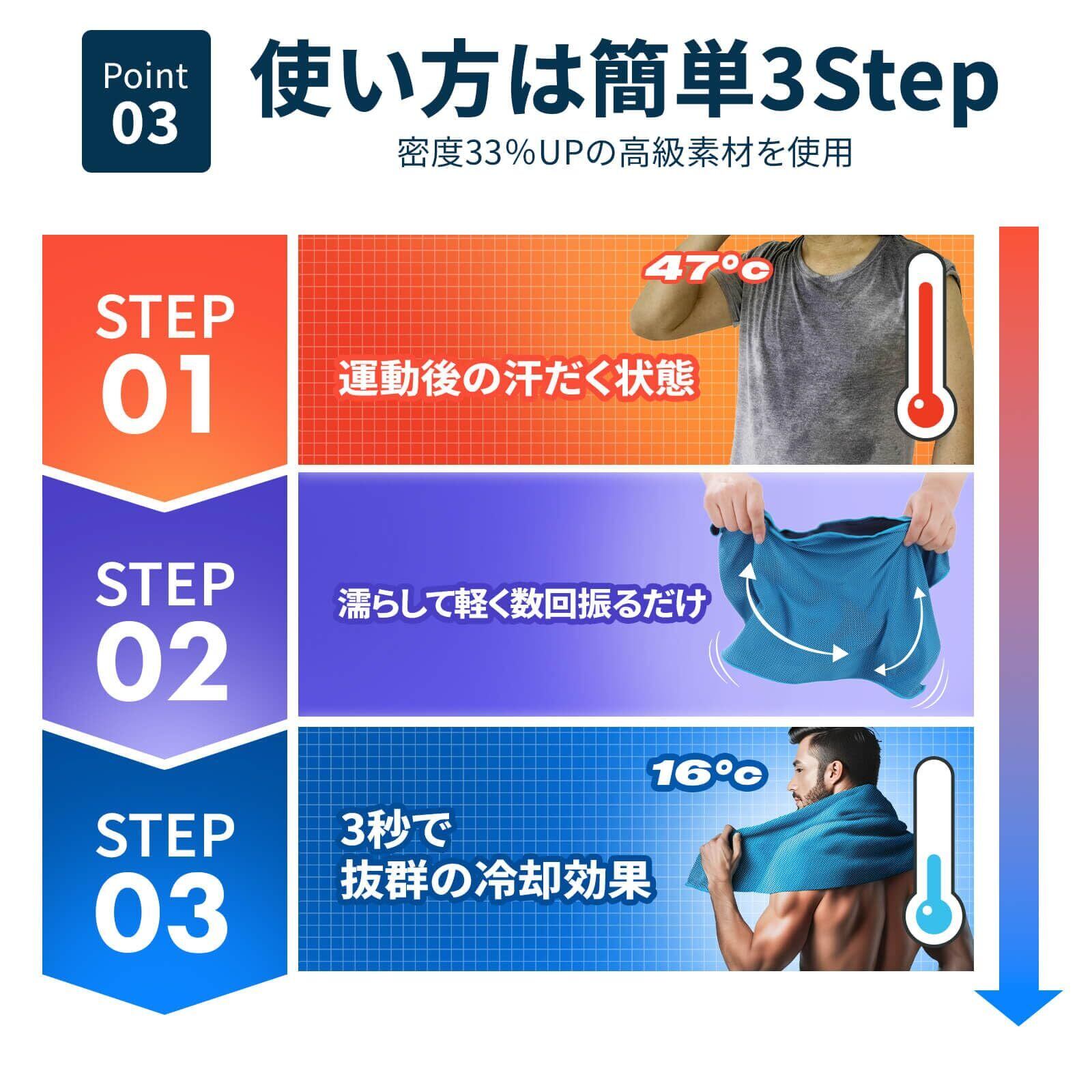 【 即効冷却】 この冷感タオルは、わずか3秒でタオルの表面温度が16℃に。湿らせて絞り、軽く振るだけでひんやり冷感を実現します。暑さ対策・熱中症対策や冷感グッズとして最適です。