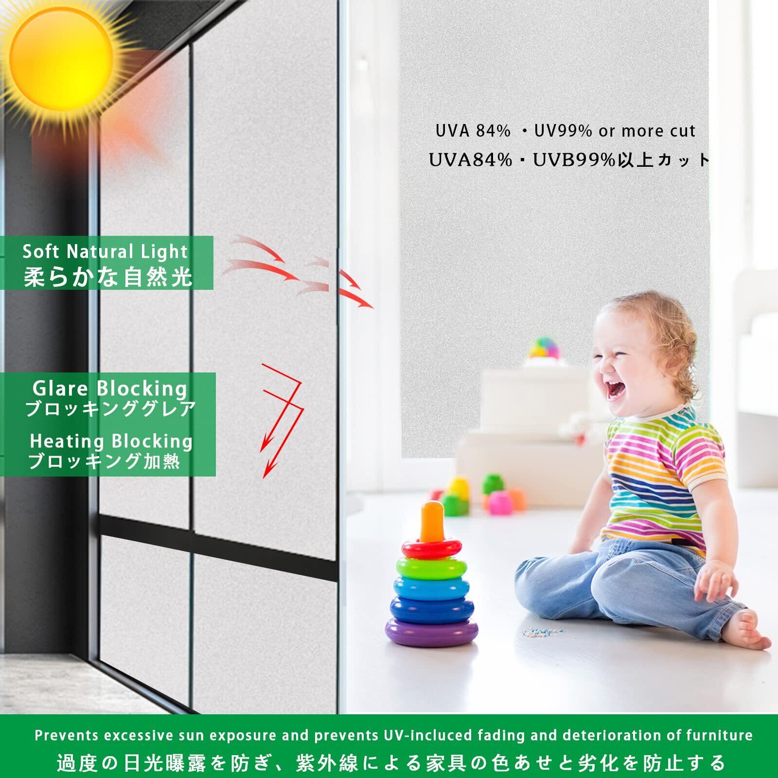 【紫外線カットフィルム--UVカット& 家具と目を守り、オシャレ感アップ】この窓 目隠し マドピタシートは、窓フィルム 断熱シートは、UVA 84%・UVB99% 以上カットし、お肌を紫外線から守り、家具や床材を紫外線による色あせ・老化などから守ります。また、断熱効果も増加。夏は少しでも涼しくなる感じます。pvc材で日差しや水に強いので、長年にわたって使用できるエコアイテムです。室内のおしゃれな雰囲気アップすることもできます。