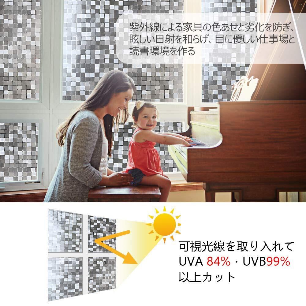 明るさもばっちり:日は完全にブロックしないので昼間の明るさはキープ、仕事、読書や勉強なども楽になり、目も疲れにくくなります。夜は複雑なデザインで内部の光を反射し目隠しの役割も担ってくれます。実験により、こちらのフィルはUVA 84%・UVB99% 以上カットし、紫外線からご家族の健康を守り、家具の色あせなどを防止できます。