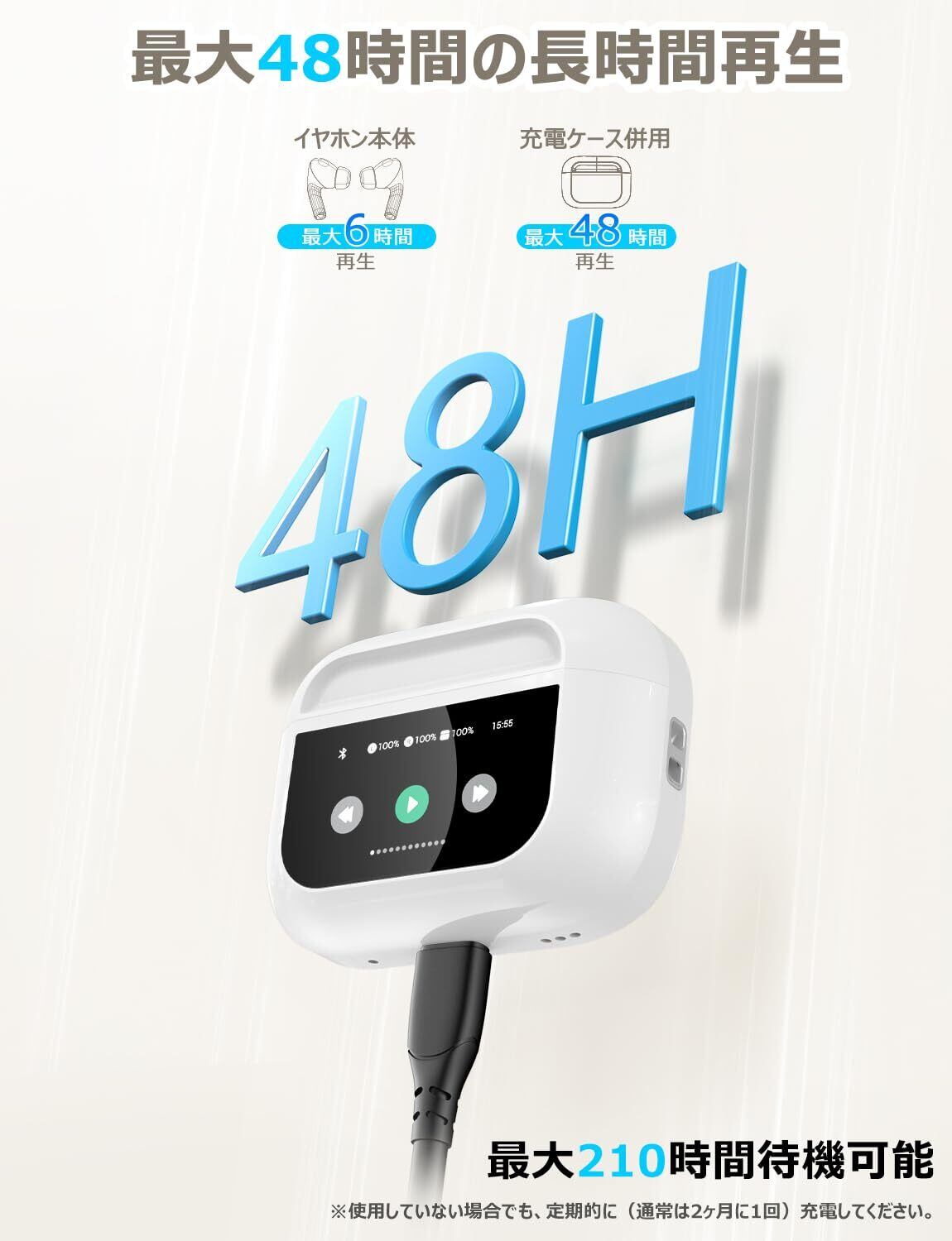 このイヤホンは、充電ケースと合わせて最大48時間の再生が可能です。急速充電に対応しており、短時間でしっかりと充電でき、いつでも使用に困りません。旅行や長時間の外出でも安心してお使いいただけます!