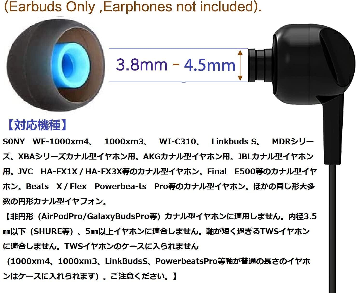 ご注意ください:非円形(AirPodPro/GalaxyBudsPro等カナル型イヤホンに適用しません。内径3.5㎜以下(SHU-RE等)、5㎜以上イヤホンに適合しません。軸が短く過ぎるTWSイヤホンに適合しません。TWSイヤホンのケースに入られません(1000xm5、1000xm4、1000xm3、LinkBudsS、PowerbeatsPro等軸が普通の長さのイヤホンはケースに入れられます)。