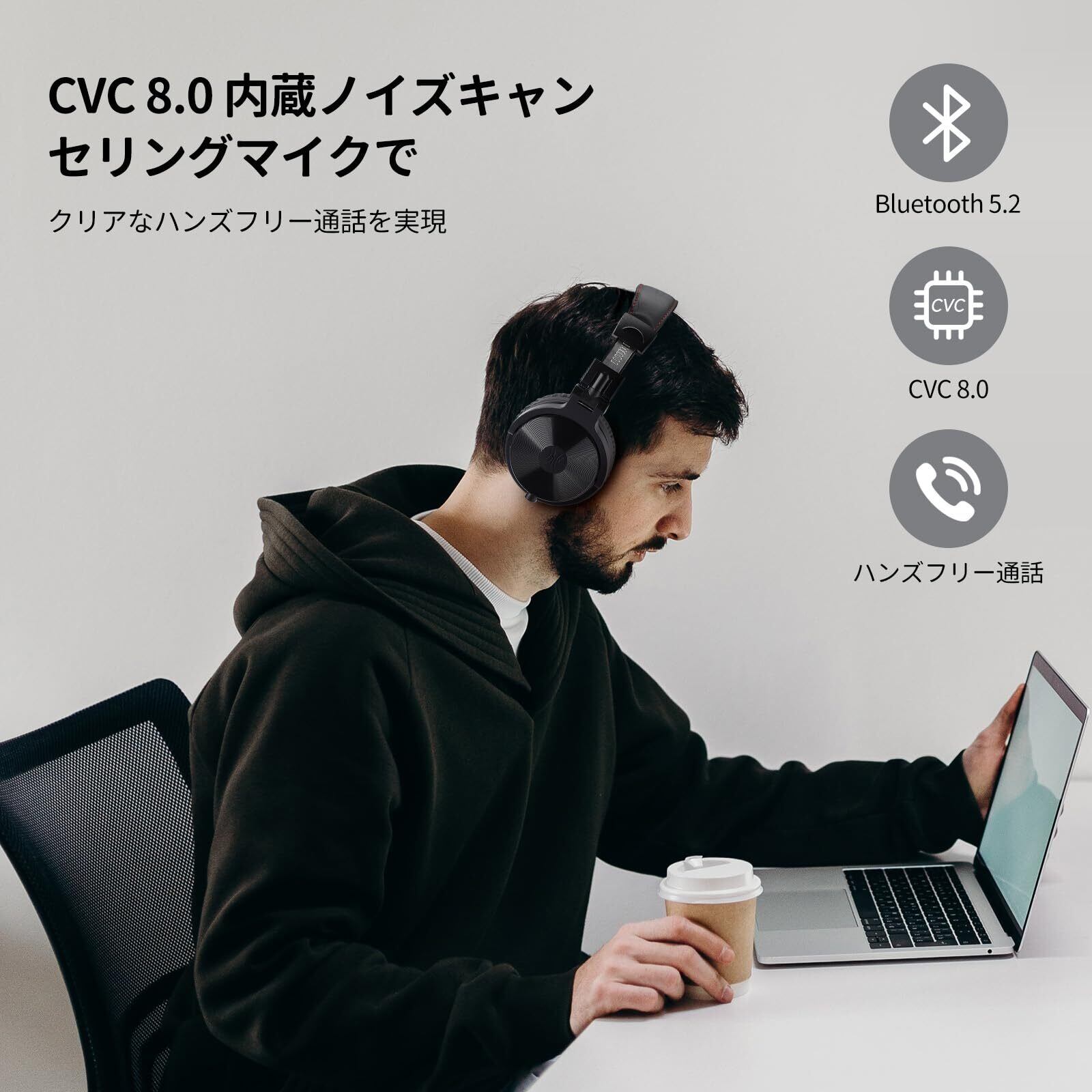【安定高速Bluetooth 5.2 & ノイズキャンセリング通話】 最新Bluetooth 5.2 と AACコーデック対応により、接続が高速で安定。音楽や動画鑑賞時の遅延を最小化し、ストレスフリーなワイヤレス体験を実現。内蔵マイクとCVC 8.0ノイズキャンセリング技術が通話時の周囲雑音を効果的に除去し、双方の声をクリアに届けます。イヤーカップのボタンで通話/音楽の操作も簡単です。