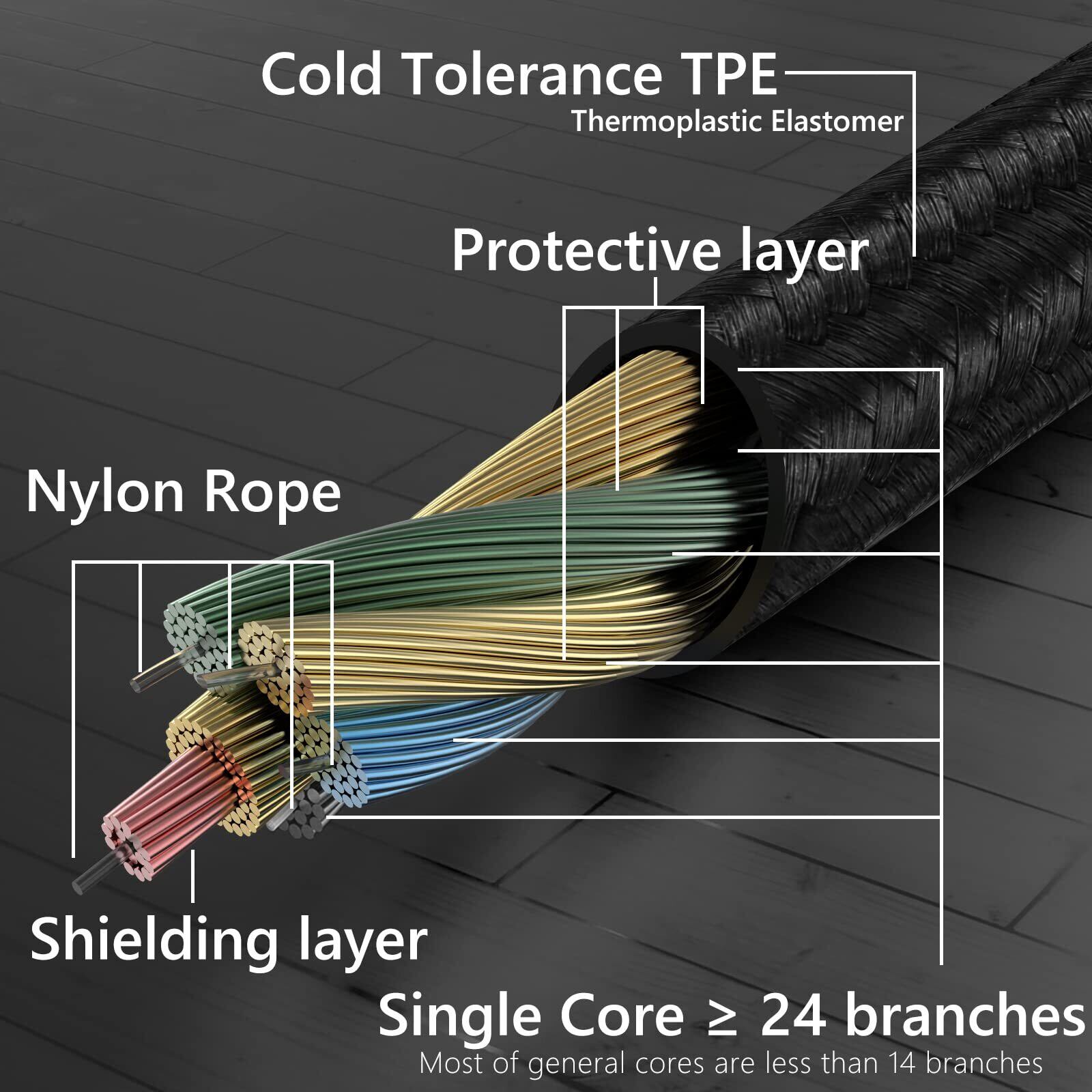 熱可塑性エラストマー(TPE)と頑丈に設計されたポリプロピレンヤーンは、電子磁気または電波干渉(EMI or RFI)に対する優れたオーディオ転送、極度の低温または高温、および最大限の保護をします。