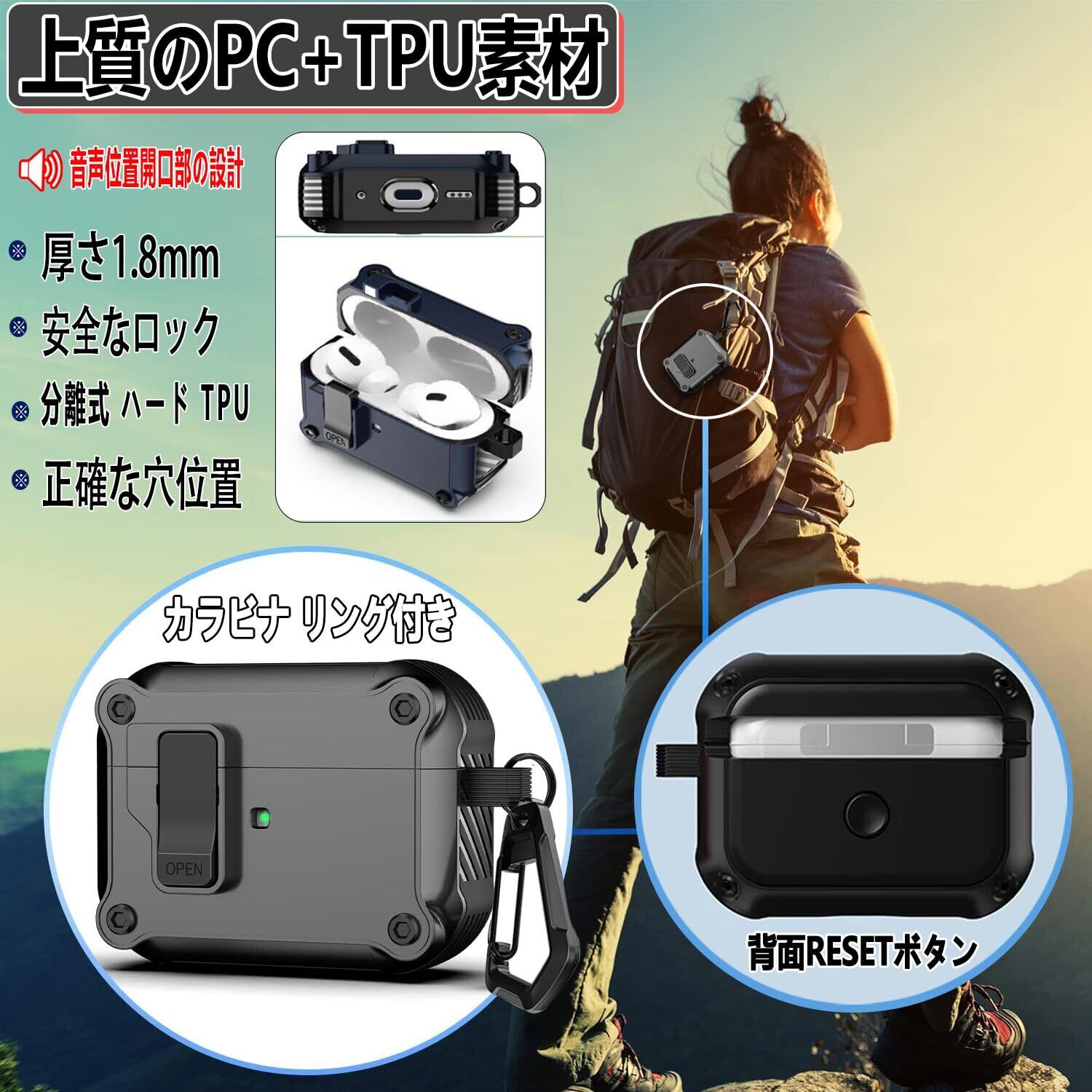 OJBSEN AirPods Pro3 ケース 2025 AirPods Pro 第3世代 ケース 安全ロック付き 自動ボタン えあーぽっつ プロ3カバー クリーナーキット付き エアーポッズプロ3カバー ワイヤレス充電対応 LEDライトが見える カラビナ付き ハード TPU 分離式 全面保護 耐衝撃 傷防止 軽量 T(ブラック)