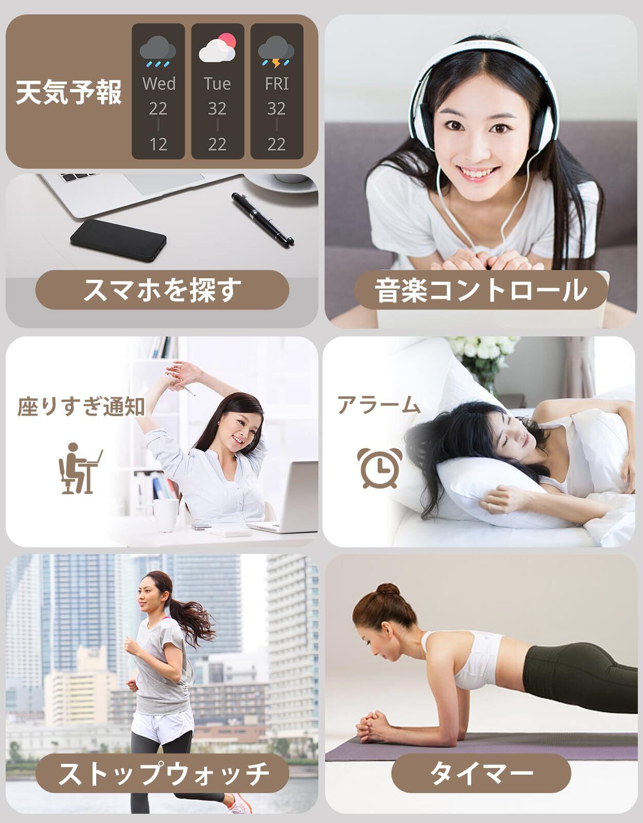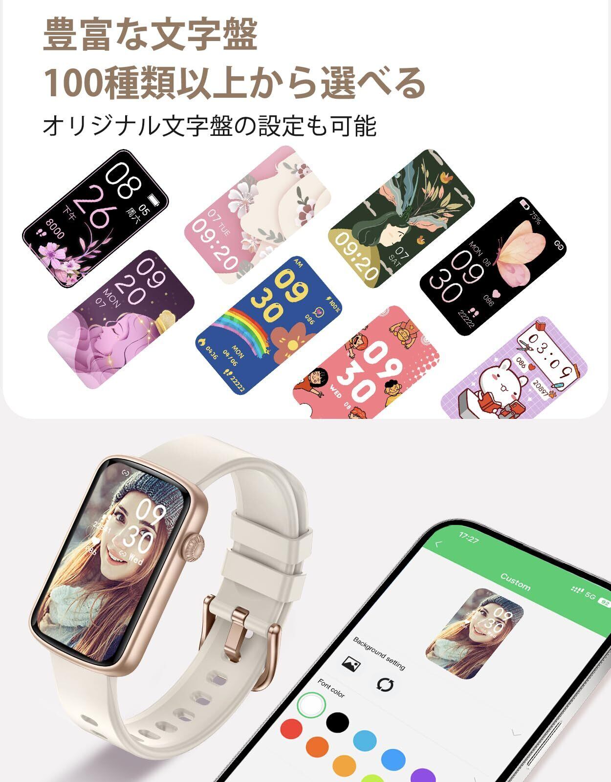 このスマートウォッチは、女性のライフスタイルにぴったりの機能を多数搭載しています。iPhoneとAndroidに対応しており、日常の健康管理やコミュニケーションをより便利にサポートします。