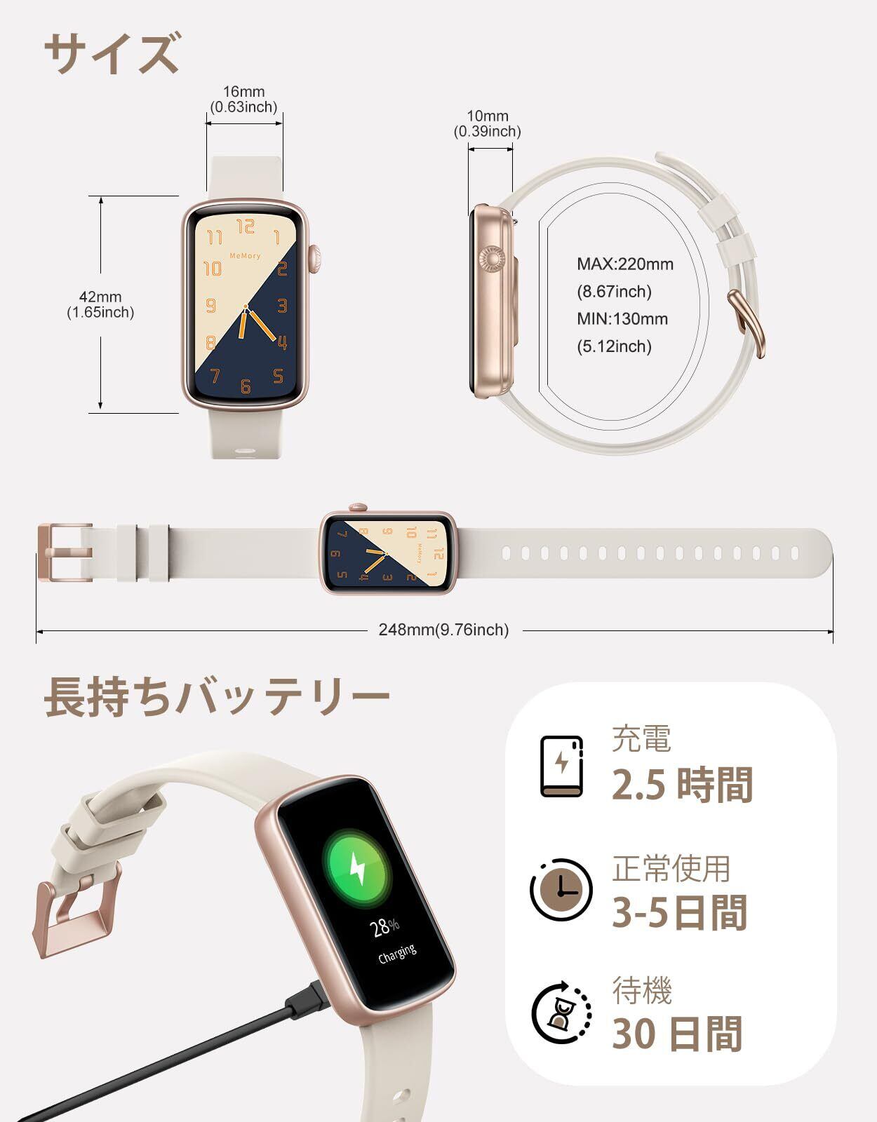 着信通知機能や女子生理サイクル記録のほか、多種類の運動モードを搭載しており、健康管理をしっかりサポートします。日々の活動や体調を気軽にチェックでき、充実した健康ライフを送るための強い味方です。