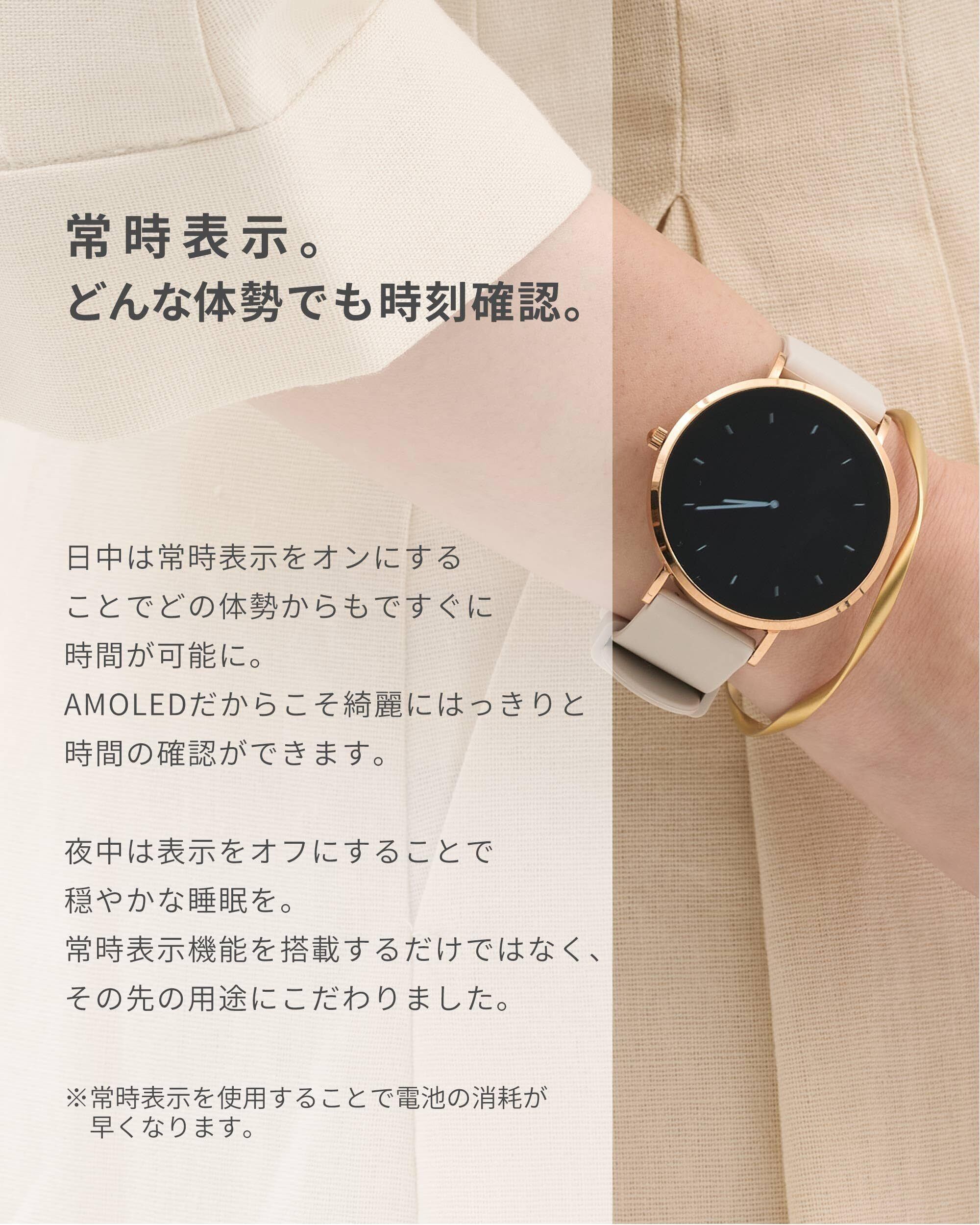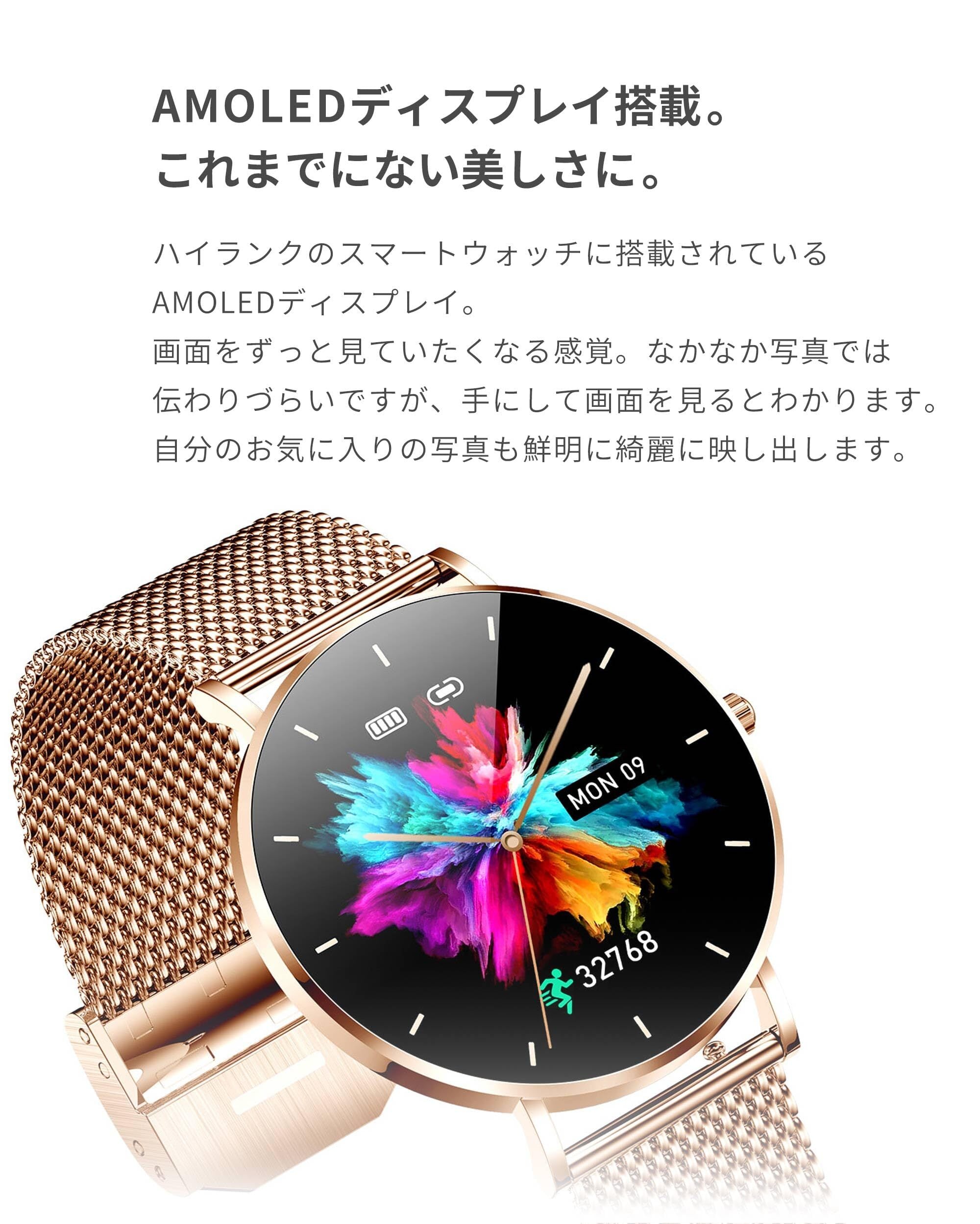 【常時表示AMOLEDディスプレイ。どんな時でもサッと時間を確認】 常時表示機能が搭載になりました。常時表示の表示方法は2つ、アナログとデジタル表示。アナログデザインが好きな方はアナログを、正確な分数まで確認したい方はデジタルを。日中は常時表示をオンにすることでどの体勢からもですぐに時間が可能に。ディスプレイはハイランクのスマートウォッチに搭載されているAMOLEDディスプレイ。画面をずっと見ていたくなる感覚。お気に入りの写真を待ち受けにして楽しもう。