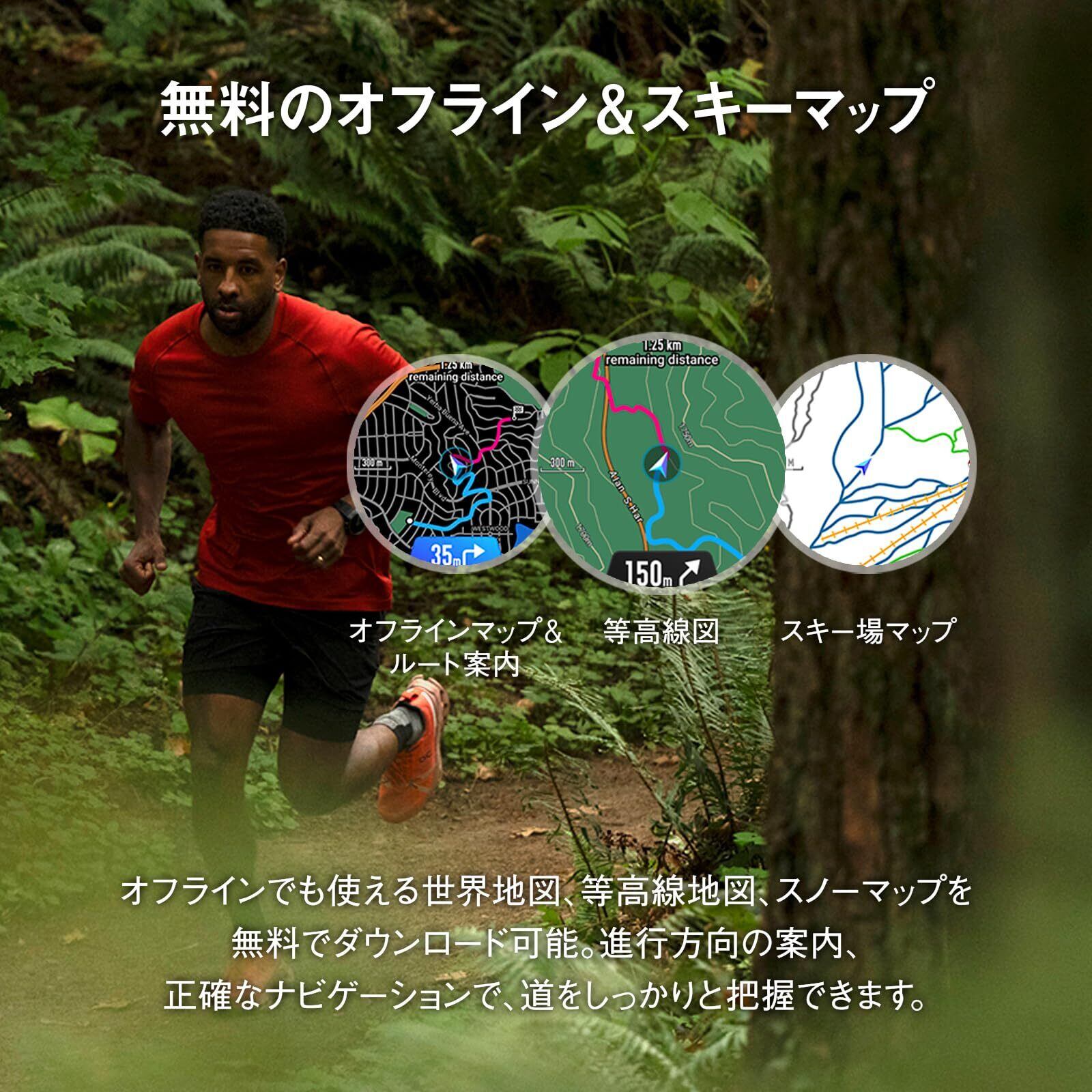 【デュアルバンドGPS&6つの衛星測位機能】新世代のGNSSチップ・低消費電力・正確な測位が組み合わさった新しい円偏波アンテナを搭載し、素早く正確な位置情報を取得できます。【3種類のオフラインマップ】ベーシック、等高線を含む山岳地図、スキーリゾートに対応したスキーマップがあり、スポーツにあったマップをダウンロードして、ディスプレイへの表示はもちろん、接続されたBluetoothヘッドフォンを通した読み上げ機能も搭載してます。