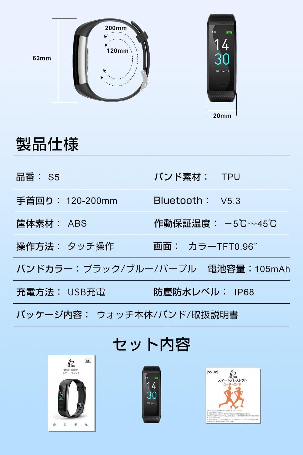 【健康管理にサポート】S5スマートブレスレットは時計タイプで、ビジネスユース・プライベートユースに関わらず人気が高まっています。活動量計、メッセージ通知、消費カロリー記録、IP68級防水、睡眠モニター、着信案内、座りがち注意、アラーム、日常生活に活躍する様々な機能を持っています。心拍数の記録やランニングの距離、歩数やペースの計測など、ワークアウトや日々の健康管理をサポートしてくれる機能も充実しています。