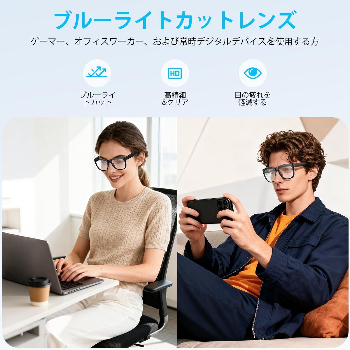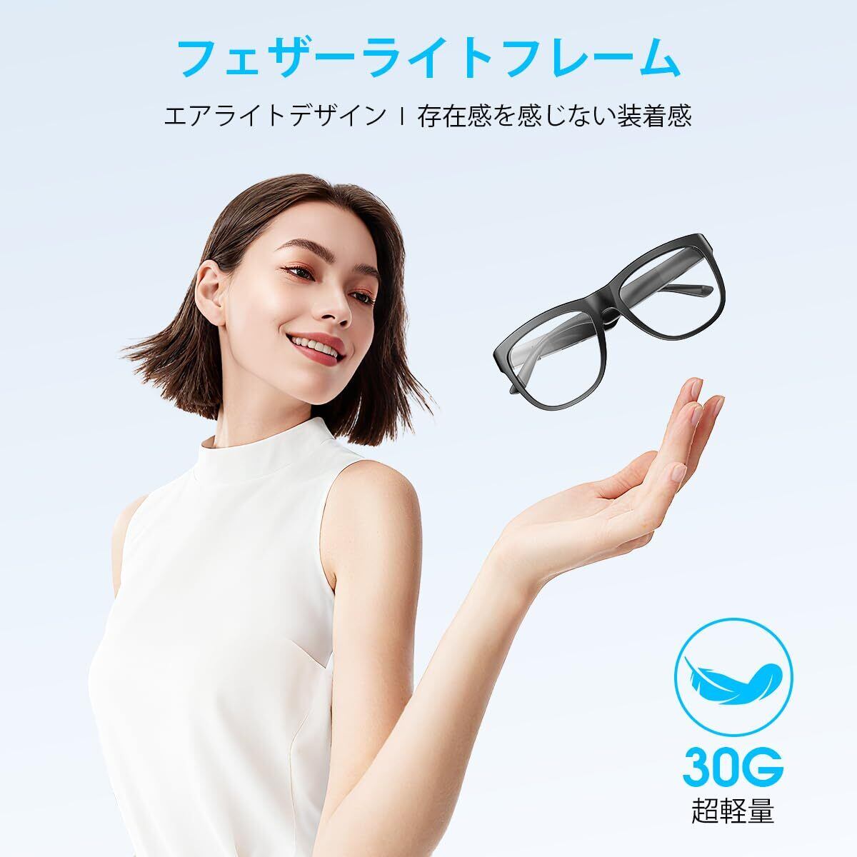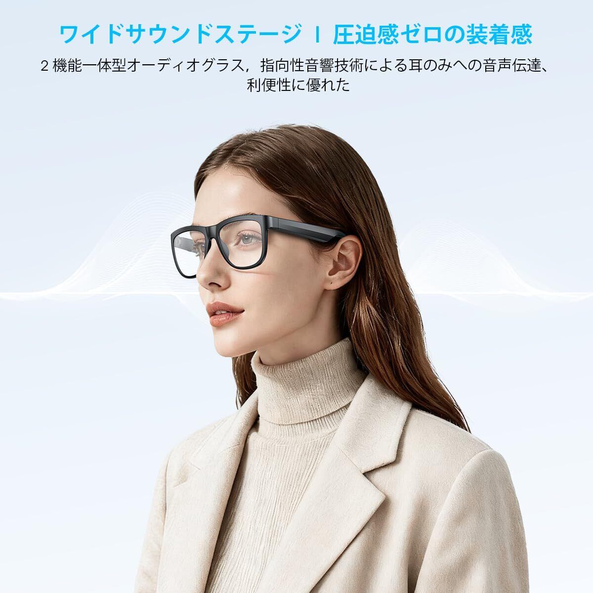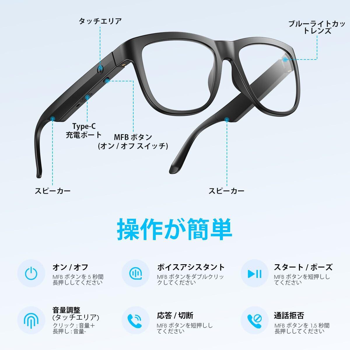 本製品は、ブルーライトカットレンズを備えたワイヤレスオーディオグラスです。PCやスマートフォンの使用時に目を守ると同時に、音楽再生や音声通話が可能な便利なアイテムです。