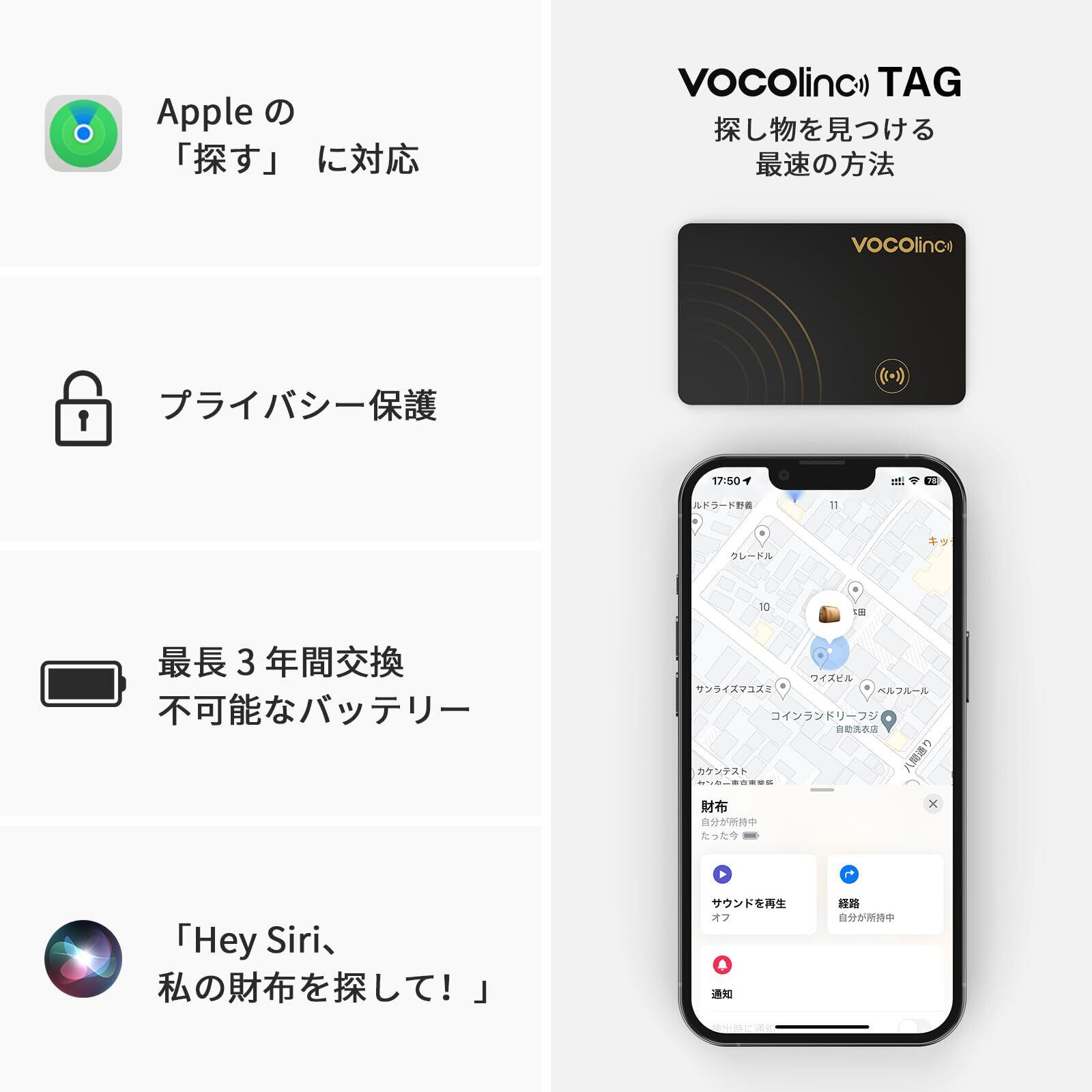 【忘れ物を簡単に見つける】VOCOlinc Airタグ カードを使用しているアイテムを Bluetooth 範囲内 (Bluetooth 範囲最大 60 m) で紛失した場合は、「探す」アプリで音を鳴らすか、Siri に助けを求めてください。
