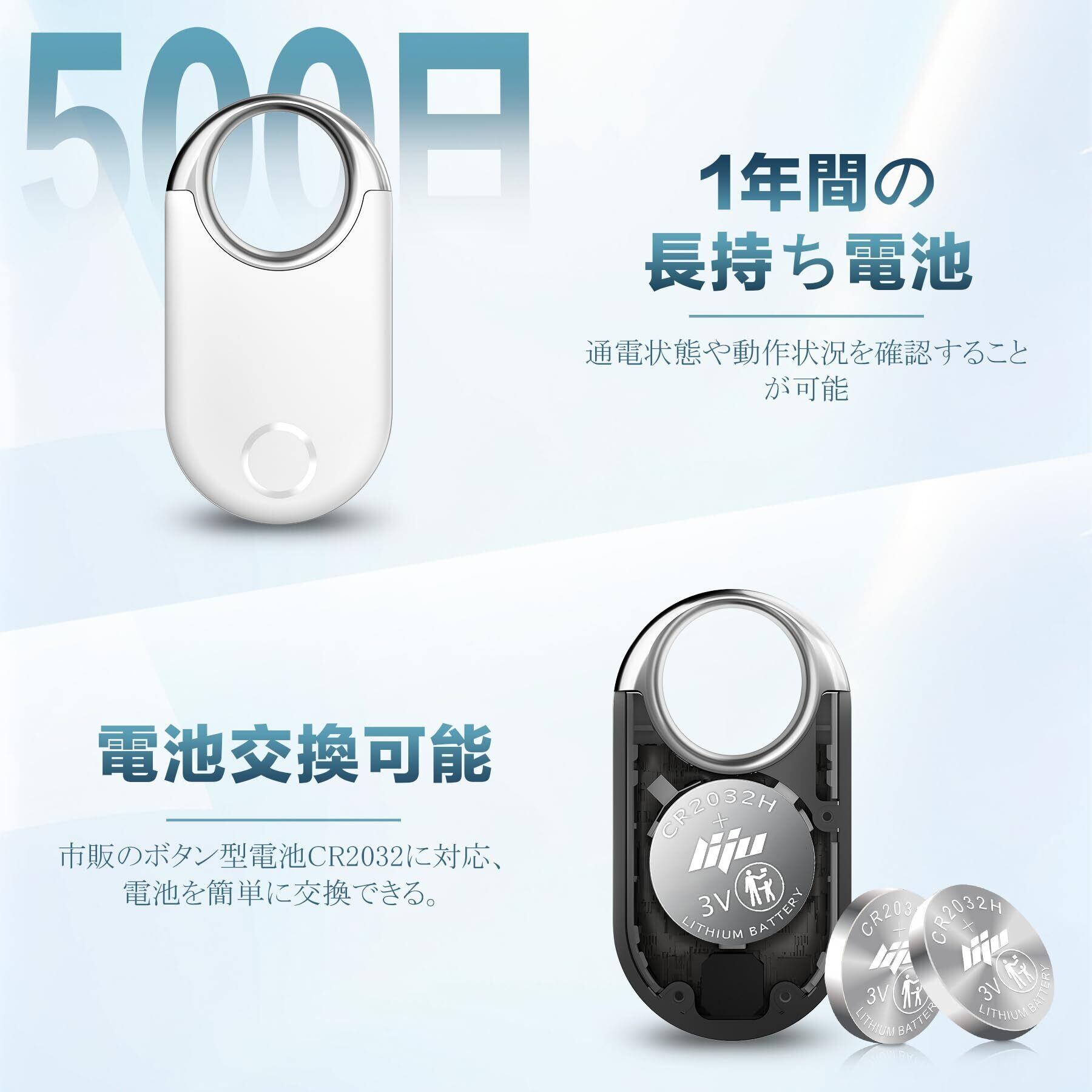 【最大500 日間・電池交換可能】ずっと安心、ずっと使える。超長寿命バッテリー搭載で、最大500日間の連続使用を実現。電池交換が可能で、製品の耐用期間に制限はありません。さらに、電源のオン/オフ、電池残量や動作状態を簡単に確認可能。日々の使い勝手と長期的な信頼性を兼ね備えた設計で、大切なものをずっと見守ります。