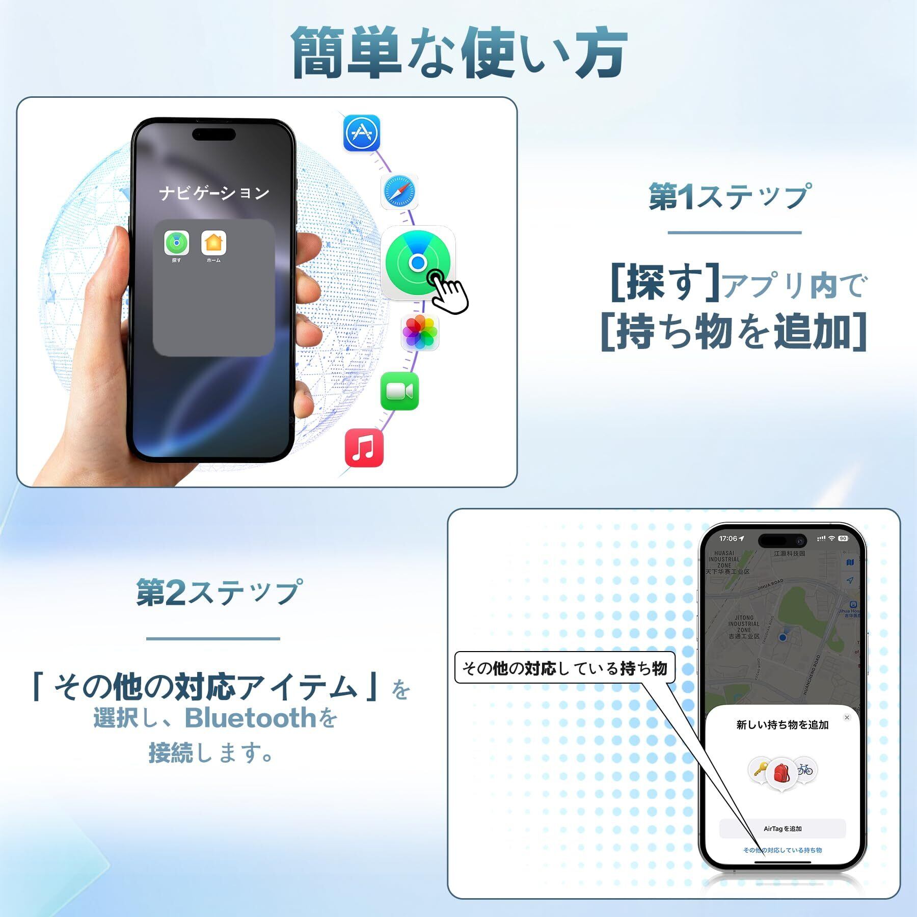 【1分でカンタン接続!初心者向け】「探す」アプリとBluetoothをオンにし、「持ち物を探す」>「持ち物を追加」>「新しい持ち物を追加」と順番に選ぶだけで、すぐに利用開始できます。 さらに、1台のiPhoneには最大28個のタグを登録可能。家族や友人と最大5人までアイテムの共有権限を設定でき、初心者でも簡単に使い始められます。