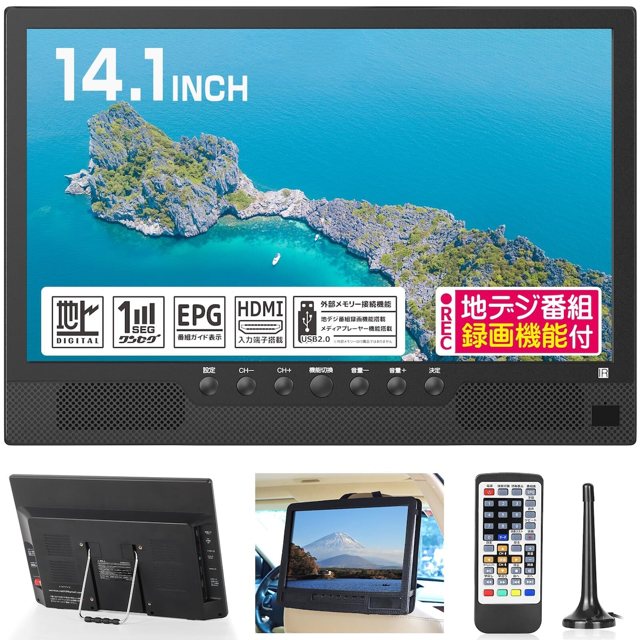 MIYOKI ポータブルテレビ 14.1インチ 小型 液晶モニター フルセグ ワンセグ 車載 地デジ 録画機能付き3WAY 3電源対応 HDMI搭載 USBメモリー再生対応 カーテレビ 車載バッグ リモコン付き (ブラック)