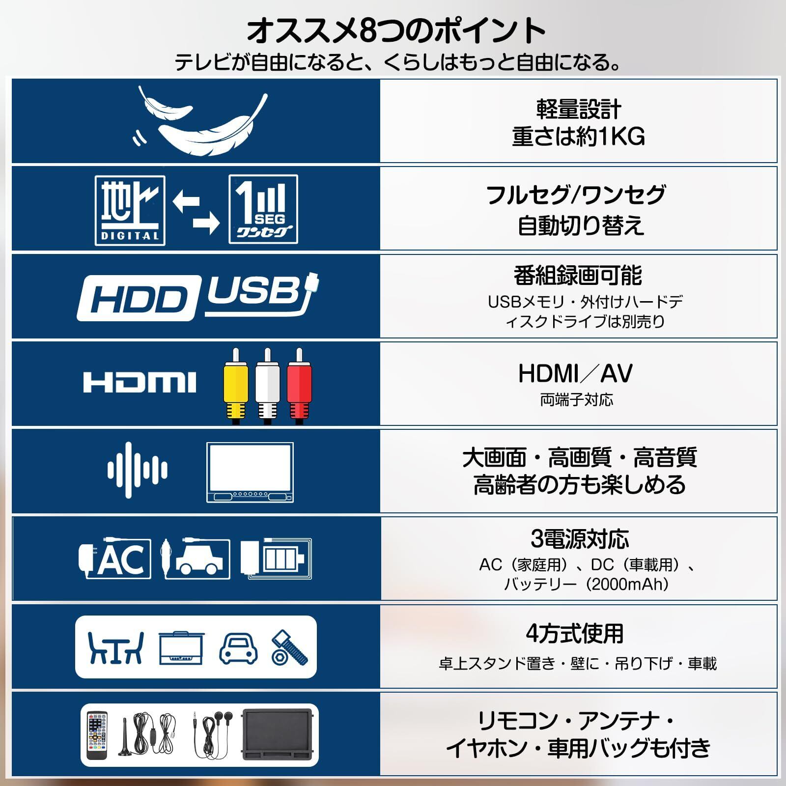 【録画機能搭載】地デジ録画機能を搭載しているので、USBハードディスクを接続すれば番組を録画しておくことが可能です。視聴中の番組を録画する「直接録画」はもちろん、日時指定できる「予約録画」も可能。◎タイムシフト機能付き※USBメモリーやHDDは別売りです。500GBまでのディスクを推奨いたします。フルセグ録画→空き容量15GBの録画用メモリーを使用すると、合計約2.5時間の番組を録画可。ワンセグ録画→空き容量15GBの録画用メモリーを使用すると、合計約100時間(4日分)の番組を録画可。録画用usb-cポータブルテレビ