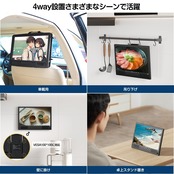 【4方式使用設置】卓上スタンド置き・壁に・吊り下げ・車載。室内やアウトドアなど幅広いシーンで使用できます。車載用バッグを付属しており、運転席や助手席のヘッドレストにしっかりと取り付けが可能。外付けハードディスクやSDカードに録画した内容を視聴することも可能です。アニメなどでドライブの時にお子さんが退屈しないよう使用することもできます。後部座席でテレビを楽しみたい方におすすめです。また、車中泊やキャンプなどにもおすすめのアイテムです。キッチンに置いて料理をしながらテレビを観るのに使用。※スタンド角度調整可卓上テレビ。裏面にネジ穴があります。VESA100*100に対応可。
