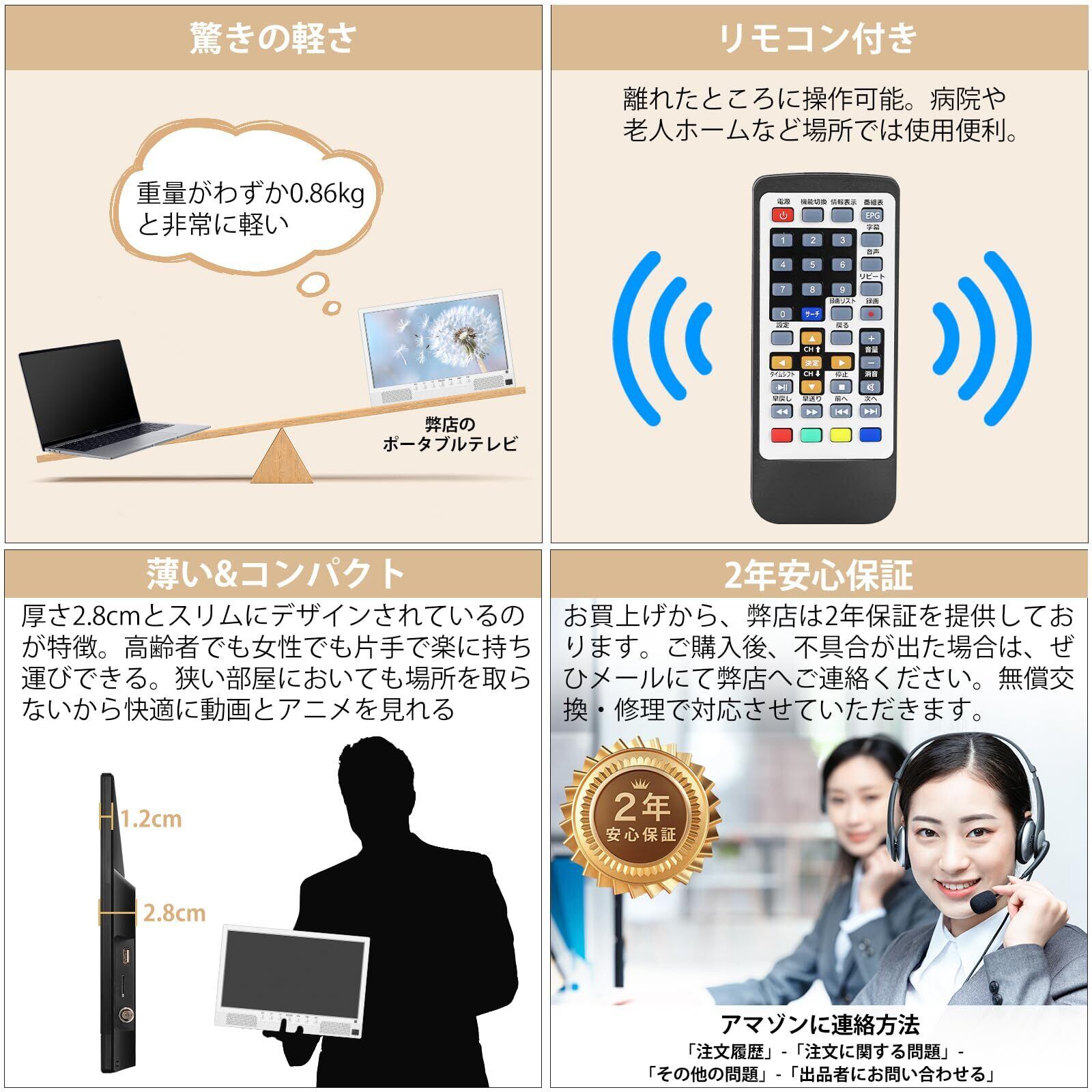 【極軽&極薄&リモコン付き】こちらの14.1インチポータブルテレビの重量がわずか0.9kgと非常に軽いです。厚さ2.8cmとスリムにデザインされているのが特徴。高齢者でも女性でも片手で楽に持ち運びできます。狭い部屋においても場所を取らないから快適に動画とアニメを見れます。リモコンが付属しているので、離れたところに操作可能です。