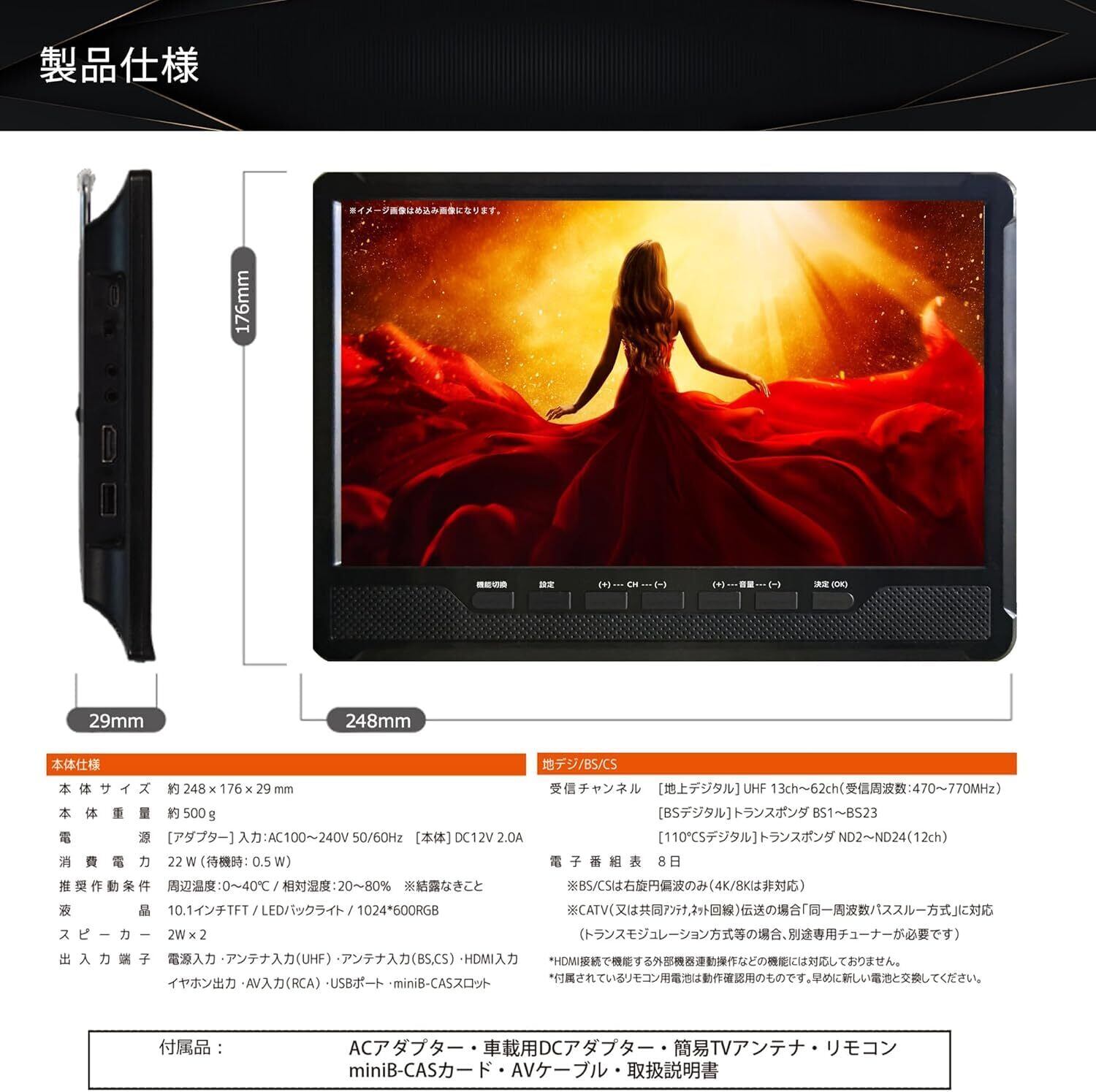 本製品は、地デジ・BS・CSのチューナーを搭載した10.1型ポータブル液晶テレビです。コンパクトながらも鮮明な映像を楽しむことができ、自宅だけでなく、車内やアウトドアでも大活躍します。お気に入りの番組や映画を好きな場所で楽しんでください!