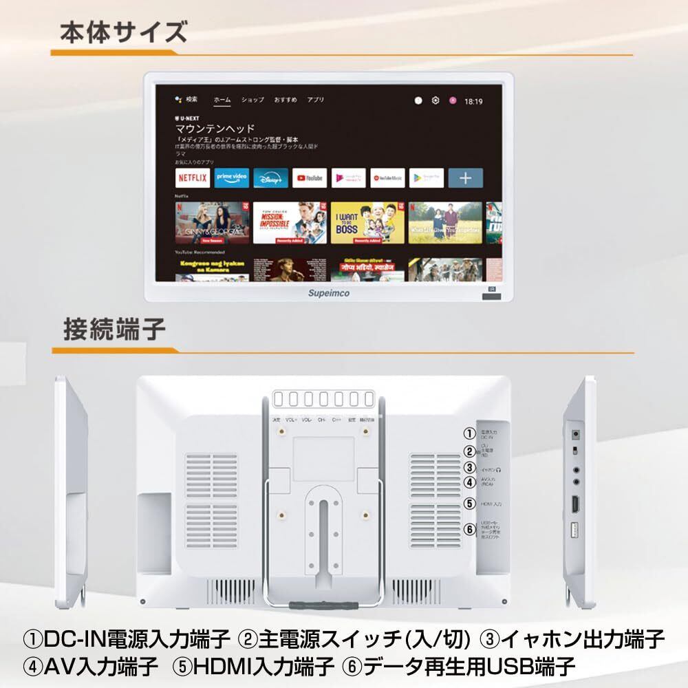 14インチ Androidスマートモニター Androidを搭載しNETFLIXや Prime等の各種ストリーミングサービスに対応、HDMI入力端子を装備しており、ゲーム機器等の外部機器と接続可能、2電源対応:家庭用AC電源、内蔵バッテリー、3wayスタイルでどこでも使用可能据置、壁掛け、車載の、メーカー1年、2025年モデル