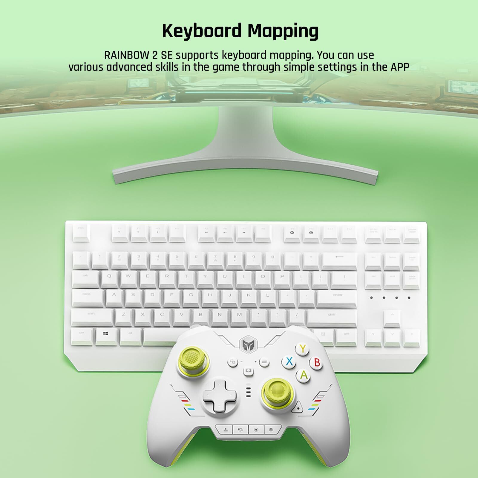 【マルチプラットフォームゲーミングコントローラー】ワイヤレスPCコントローラーRainbow 2 SEは、Switch、Windows10&11、Android7.0+、iOS14.0+で動作します。 PC コントローラーは、2 つのカスタム バック ボタン、2 つのトップ ボタン、モーション エイミング、ターボ、マルコ、デュアル モーター、ホール効果トリガー、3 セットのジョイスティック、4 方向および 8 方向方向パッド、1000 Hz の有線ポーリング レート、 2000 レベルの軸解像度、内蔵 Bluetooth、キーボード マッピング、PC 上のアプリ (携帯電話ではサポートされていません)。 【音声は非対応です】
