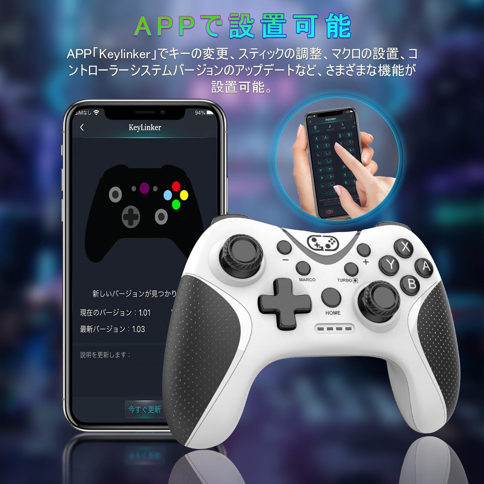 【APP対応&パッケージ内容】人間工学に基づいたデザイン、長時間持ち続けても疲れにくいです。グリップの表面はABS軽量材料で、表面滑り止め加工を施しており、手触りが心地よくて、しっかりと握ることができ、ゲーム中手汗などで滑る心配いりません、存分にゲームを楽しむことができます。こだわりの細部デザイン、ボタンの精度を高め、耐用性もさらにアップさせる。さらに、APP Keylinkerでコントローラーの初期化、連射の設定、キーテスト、ボタンの割り当て、スティックのデッドゾーンの調整、振動強度の調節、マクロプログラミング、ジャイロセンサーの補正など様々な機能の設定や調整ができます。パッケージ内容:コントローラー本体×1、充電ケーブル×1、日本語取扱説明書×1。※ご購入後に不具合や初期不良などの場合は、是非お気軽に販売元に連絡して下さい。