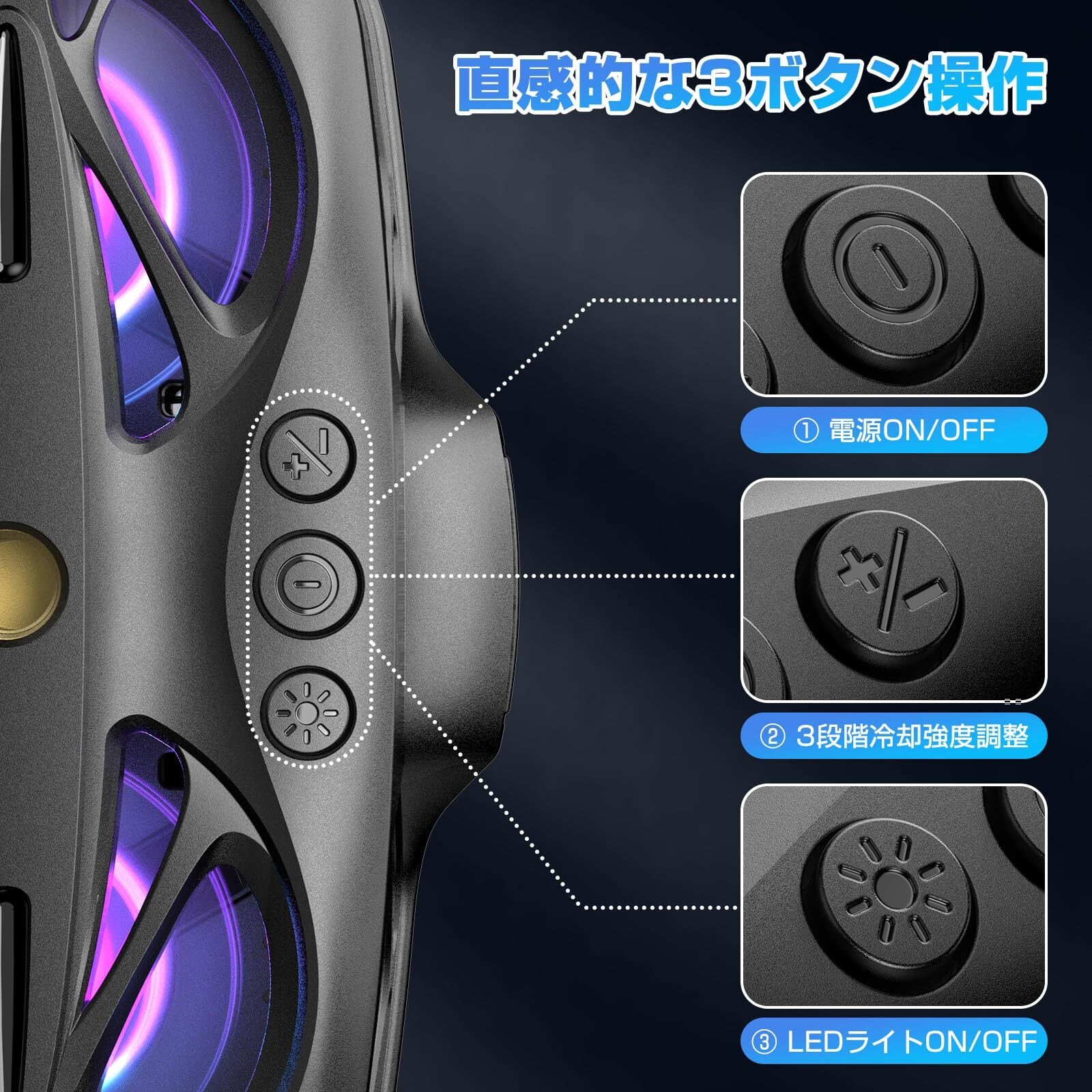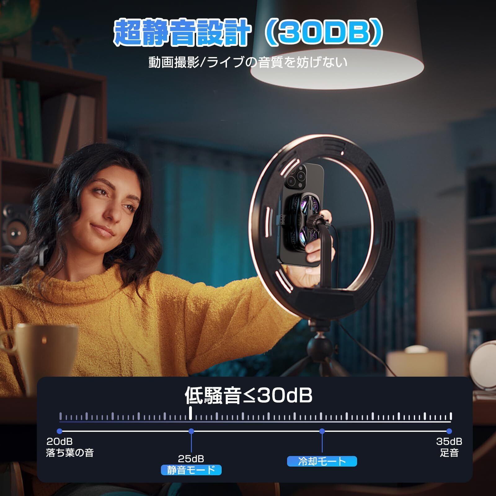 【静かで便利な冷却操作】 30dB以下の図書館レベルの静音設計で、ライブ配信中でも音を気にする必要がありません。電源・冷却強度・LED照明の3つの独立ボタンを搭載し、夜間の配信時には不要な照明をオフにできるなど、細かい調整が可能です。冷却機能だけが必要な時も、LEDだけを点灯させたい時も、シーンに合わせて自由にカスタマイズできます。