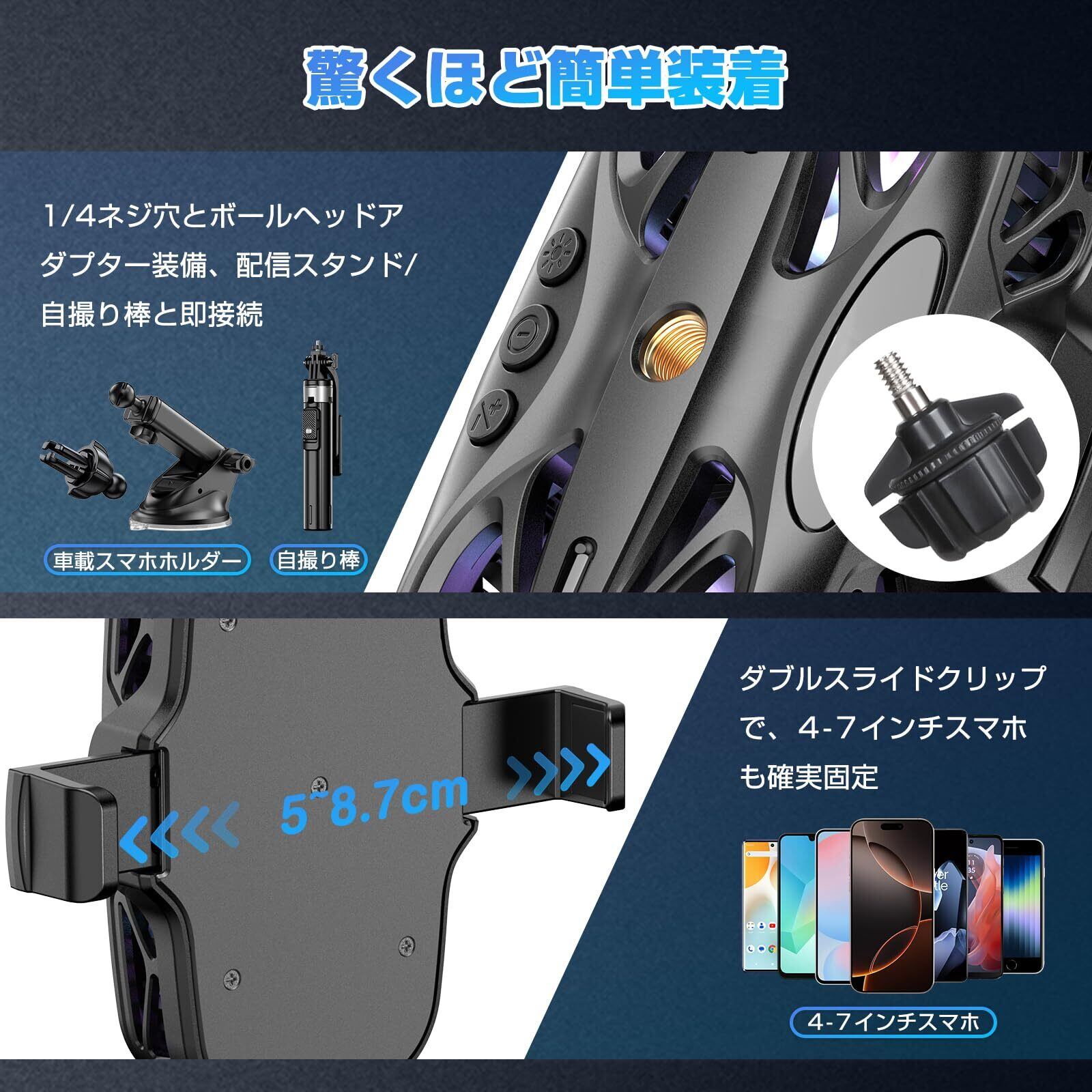 【ライブ配信に最適な冷却スタンド】 三脚や自拍棒に直接取り付け可能な1/4ネジ穴とボールヘッドアダプター付き。スマホを固定しながら背面全体を効率冷却する対向式ファン設計で、長時間のライブ配信でも過熱による画質低下を防止。4-7インチのスマホにしっかり固定可能なダブルスライドクランプを採用。
