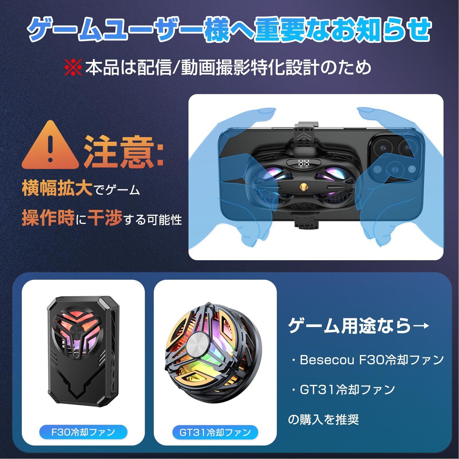 【ご使用上の注意】 本製品はライブ配信・動画撮影・車載使用に最適化された設計のため、大型冷却プレートを採用しています。ゲームプレイ時の操作性を重視される場合は、よりコンパクトな「Besecou F30冷却ファン」または「GT31冷却ファン」のご利用をおすすめします。電圧不足だと冷却性能が低下します。推奨電源:5V/2A以上のアダプター使用