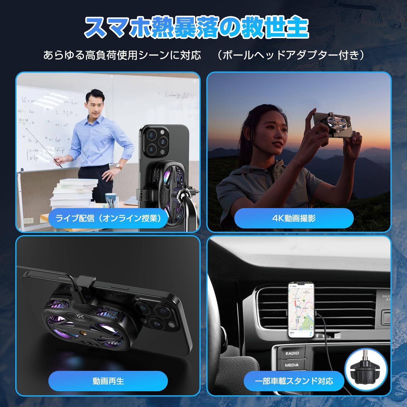 【マルチシーン対応の高性能冷却】 ライブ配信スタンドや車載ホルダーへの取り付けにも対応した万能設計。4K動画撮影や長時間ナビ使用時など、スマホが高温になりやすい様々なシーンで活躍します。特に夏場の車内でのナビ利用時、スマホの過熱によるバッテリー劣化や動作不良を効果的に防止。配信、撮影、移動中など、あらゆる場面でスマホの性能を最大限に引き出します。
