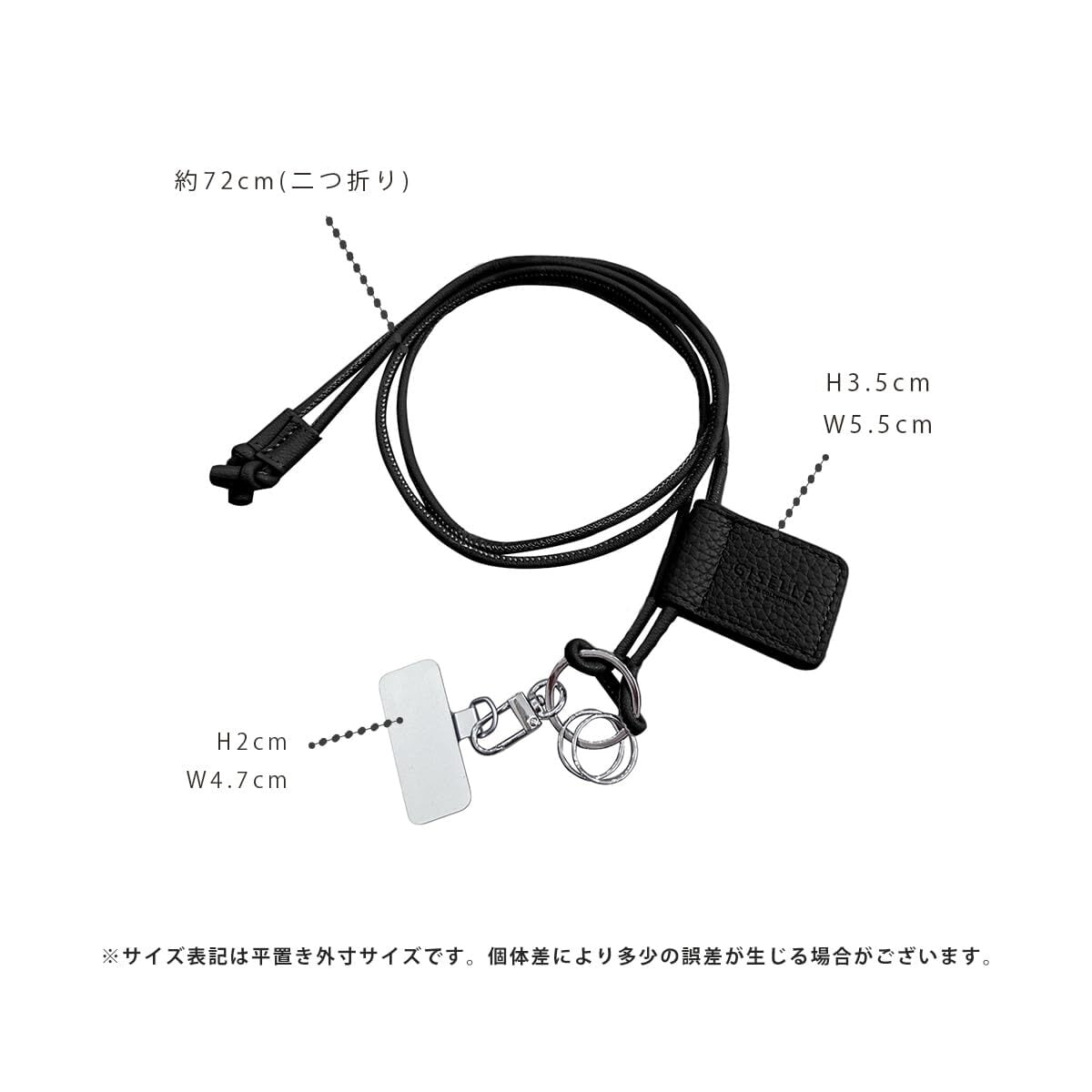 【サイズ(約)】ストラップ長さ:72cm(金具含まない)、シート金具;高さ2cm×幅4.7㎝、タグクリップ:高さ3.5㎝×幅5.5㎝