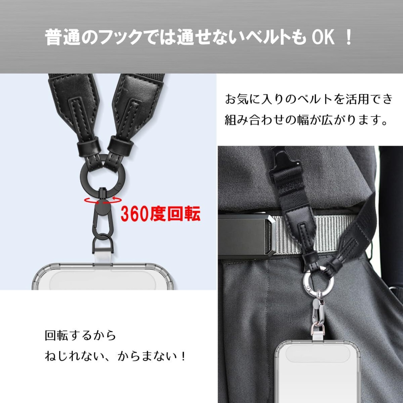 回転式の金具を採用しているため、ストラップが絡まる心配がありません。手軽に取り付けることができ、スマホを安全に持ち運ぶことができます。これ一つでスマホをしっかりと保持しつつ、他の作業も自由に行えます!