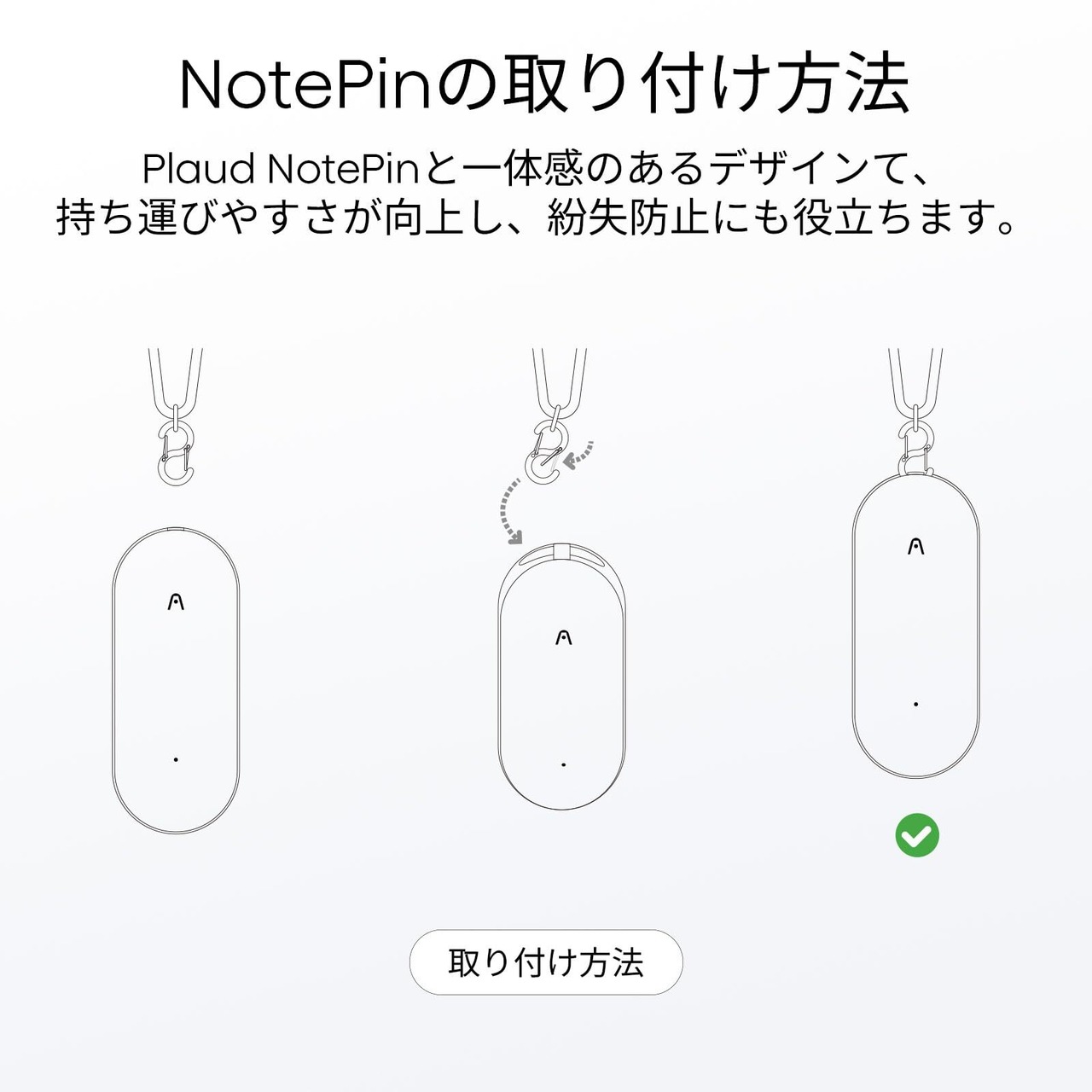 【取り付け簡単】ネックストラップに付属の合金製フックをNotePinのリングにカチッと連結するだけで、NotePinと一体感のあるAIアクセサリーが完成します。
