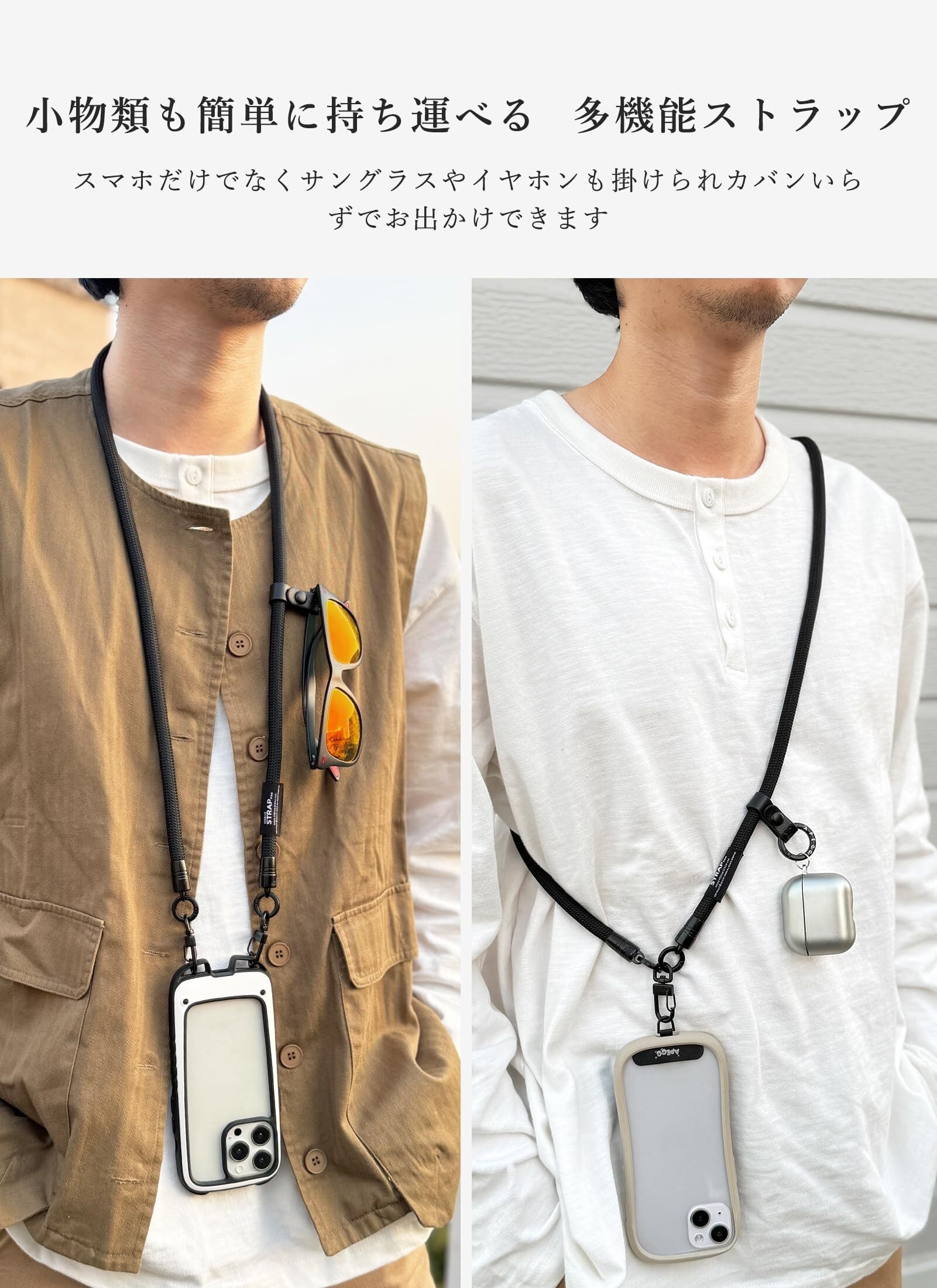 このショルダーストラップは、長さ120cm、太さ10mmの設計で、肩掛け・首掛けのスタイルが可能です。すべてのスマートフォンに対応しており、落下防止機能を備えた頑丈な金属パーツが使われていますので、安心してお使いいただけます。