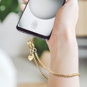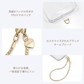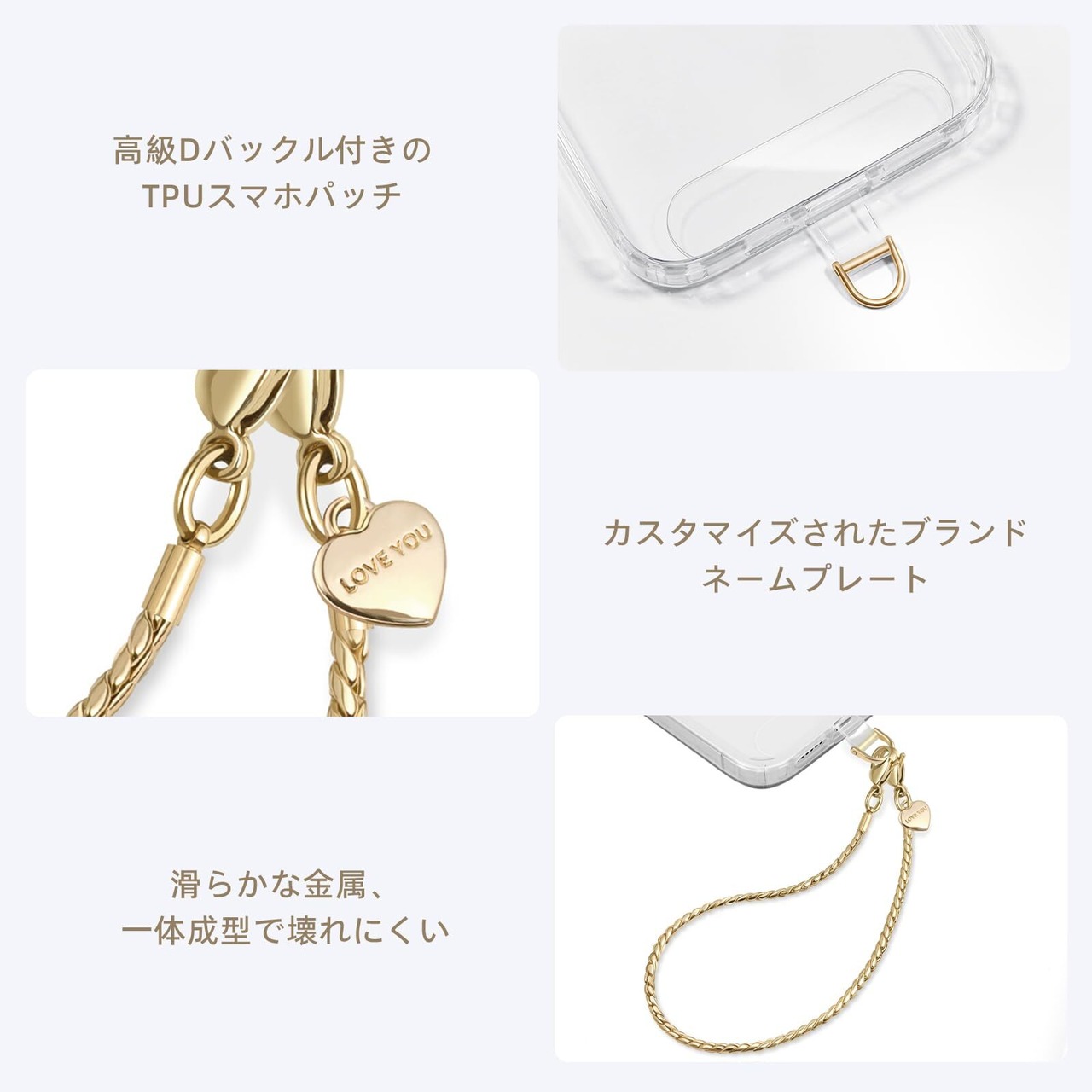 ストラップの取り付けは簡単で、手首に優しいデザイン。スタイリッシュなゴールドが、どんなファッションにもマッチし、持っているだけでおしゃれな印象を与えます。斜め掛けも可能で、両手が自由になるため、スマホを使いながらの移動も快適です。