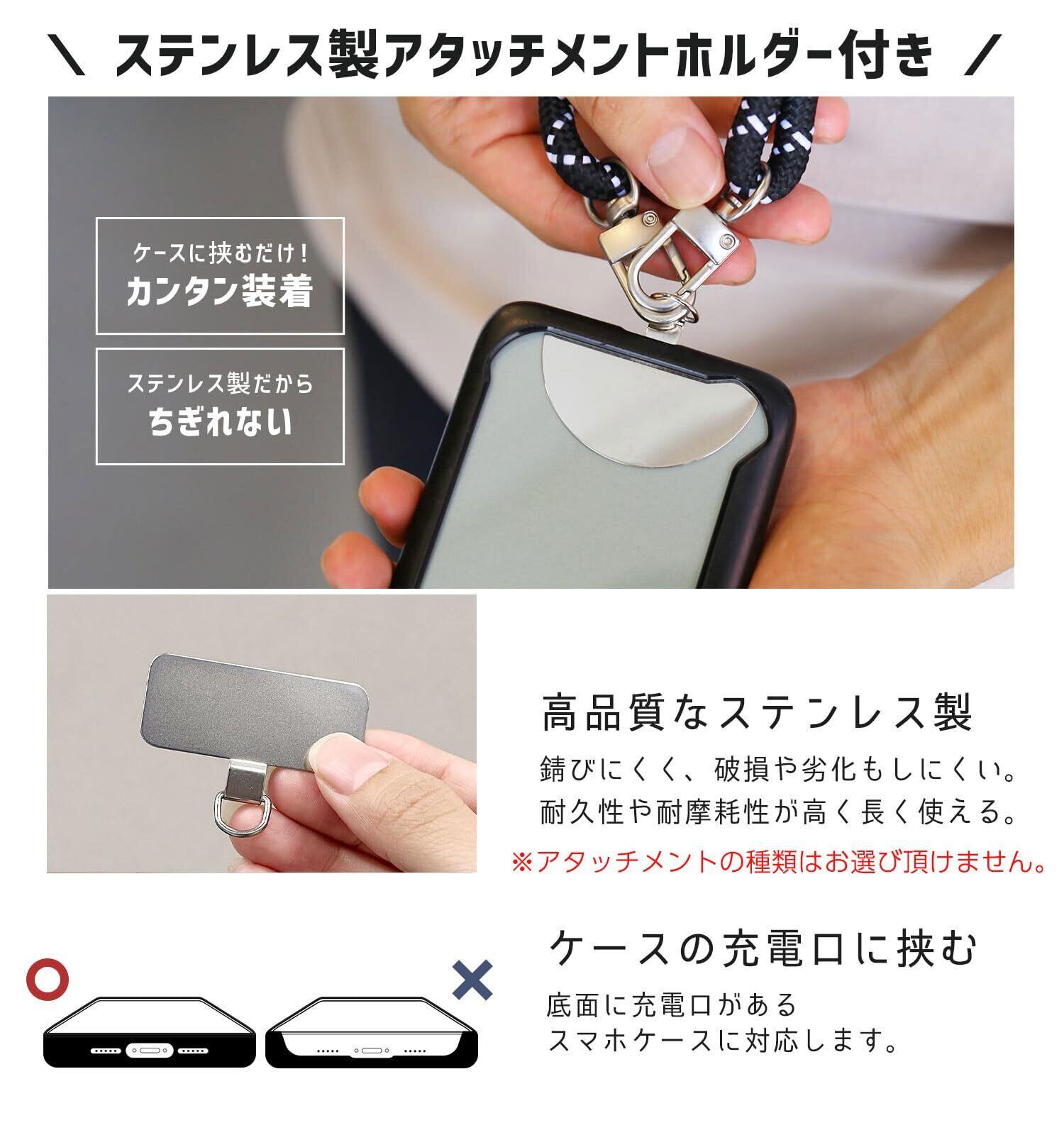 【ステンレス製アタッチメントホルダー】スマホショルダーにはステンレス製のアタッチメントホルダーが付属しています。スマートフォンのケースの充電口に挟むだけで簡単に使用できます。ステンレス製で錆びや耐久性にも優れているため長く愛用できます。