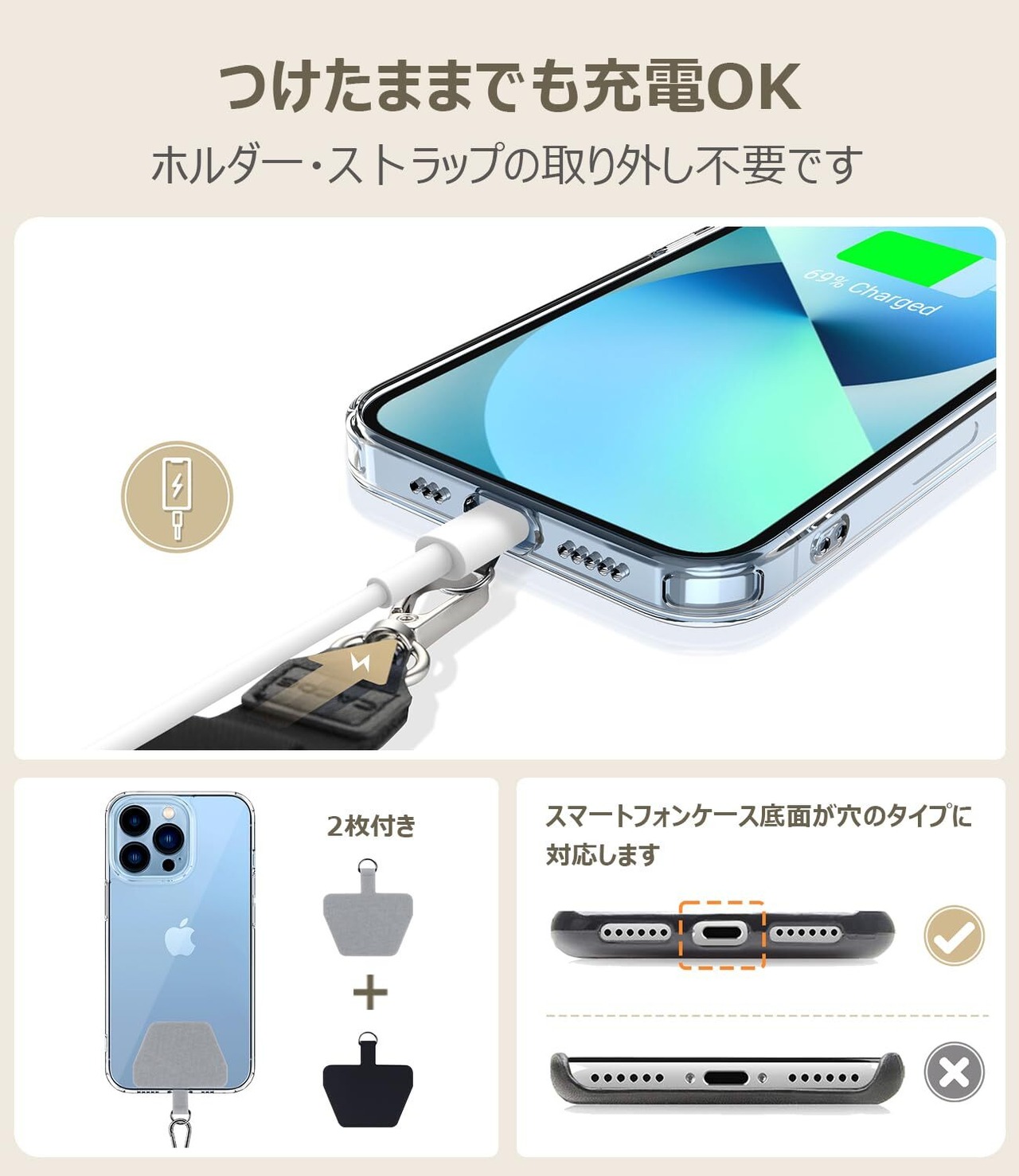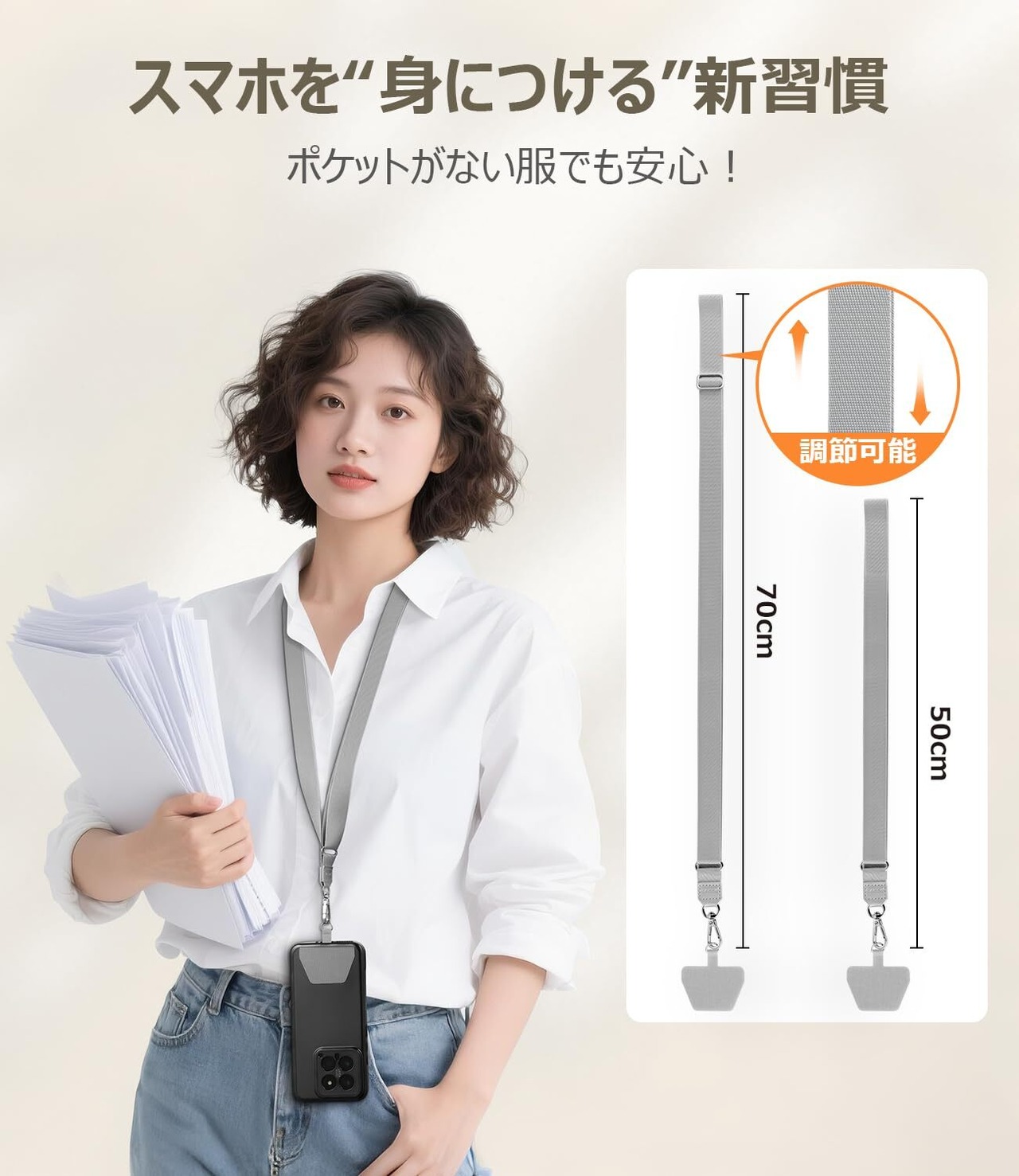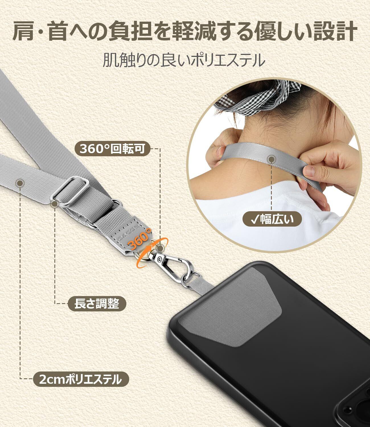 このストラップは、両手を自由に使えるため、移動中でもスマートフォンを安全に保持します。落下防止機能があり、安心して持ち運ぶことができるため、ファッションの一部としても活躍します。幅広のデザインで、肩への負担も軽減され、快適さを提供します。