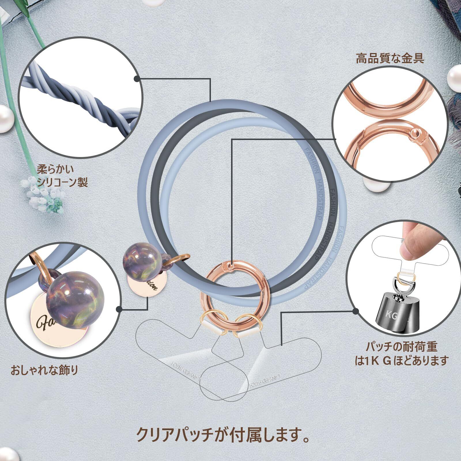 「シリコーン素材にこだわりの金具」素材に関しては、汚れにくい、味がしないシリコーンを使っています、伸縮性があるため長時間使っても変形しません。リングにある金具は、特注の高品質の形でスマホを掛けるにピッタリマッチします、錆びにくいと同時ピカピカの金色で上品感アップ!