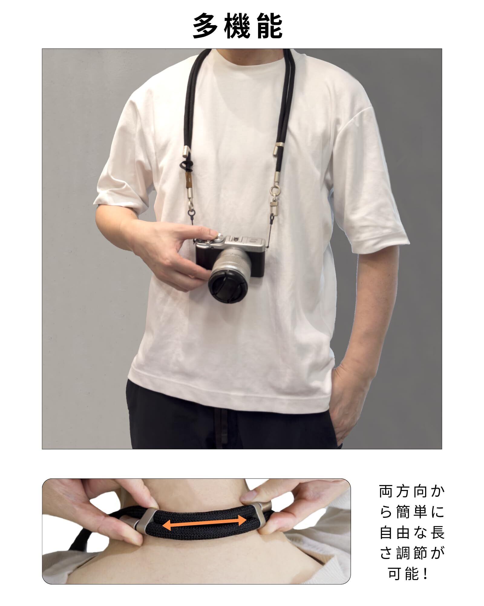 【長さ調節可能・スライド式で簡単&スピーディー】ストラップの長さは約80cm〜150cmまで調節可能で、身長や使用スタイルに合わせてぴったりのフィット感を実現できます。シーンに応じてスマホを首にかけたり、肩にかけたりと自在に使えるスマホストラップ・携帯ストラップです。