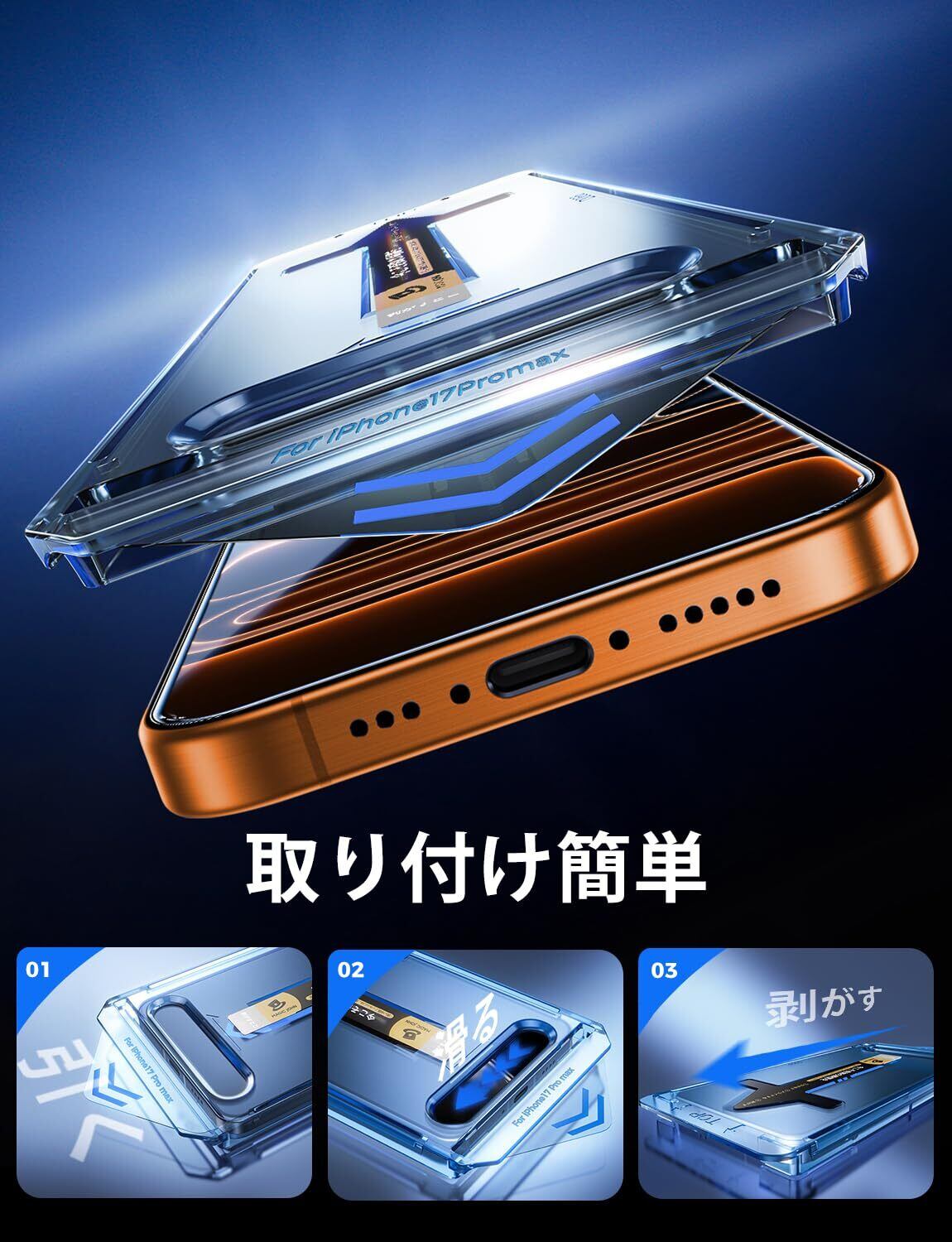 【もう失敗はしない】本製品は対応 iPhone 17 Pro Maxに対応するガラスフィルム2枚セットです。百万以上の欧米ユーザーのフィドバックを集めて日々改善したガイド枠は、3歩だけで保護フィルムを貼り付けます。そのうえ、自動ホコリ取りデザインだけでなく、ガイド枠のスロープデザインで、空気を順序に取り除くことができて、初心者でも気泡レスのまま綺麗に貼れます。