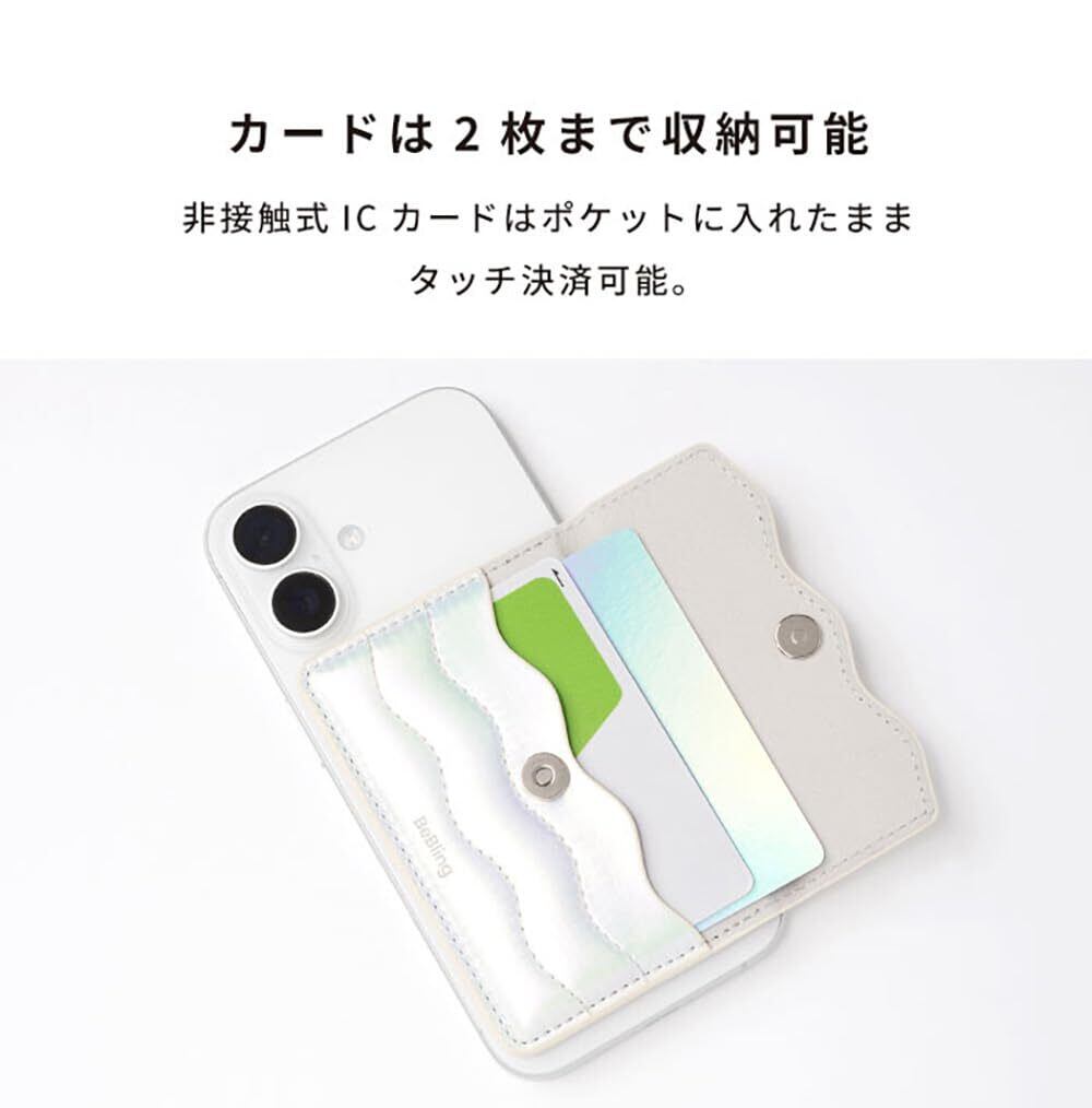 【カードは2枚収納可能】開閉ボタンはマグネット式でカードが飛び出す心配がありません。マグネット内蔵だから、簡単に取り外しOK。付属しているメタルリングステッカーは、かわいいウェーブデザイン。【付属品】メタルリングステッカー1枚/貼り付けガイド/仮止めシール ※Look in Clear・Reflectionとは併用できません。