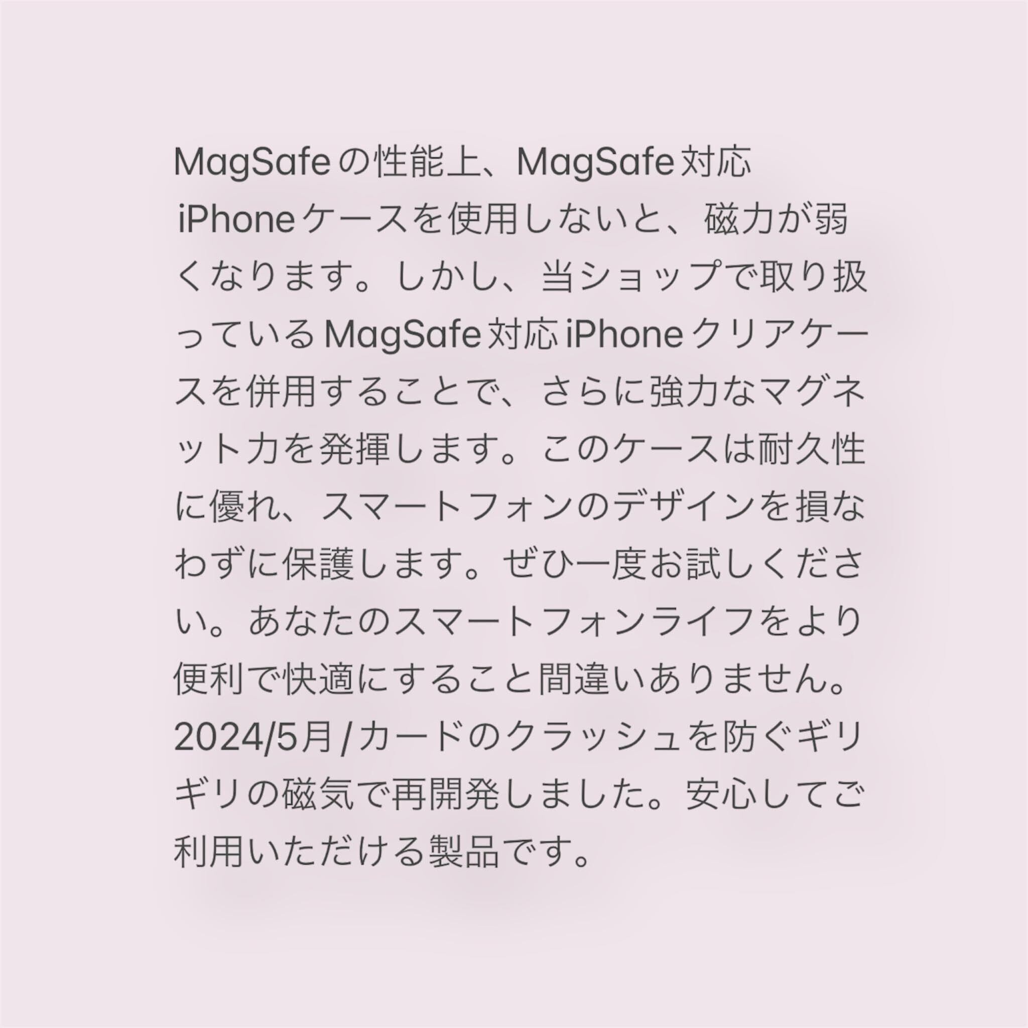 MagSafe対応ケースを使用しないと、磁力が弱くなります。しかし、当ショップで取り扱っているMagSafe対応クリアケースを併用することで、さらに強力なマグネット力を発揮します。このケースは耐久性に優れ、スマートフォンのデザインを損なわずに保護します。ぜひ一度お試しください。あなたのスマートフォンライフをより便利で快適にすること間違いありません。 当ショップ取扱いのMagSafe対応クリアケースと併用してお使い頂きますと、さらにマグネットが強力になります。ぜひ一度ご利用下さい。 ※2024/5月︎カードのクラッシュを防ぐギリギリの磁気で再開発しました。安心してご利用いただける製品です。ご購入前にご確認ください。 カードポケットのみの販売となります。スマートフォン本体とスマホケース等は付属致しません。 ディスプレイ、モニターの設定等により実際のお色目は画像と違う場合がございます。 MagSafe対応iPhoneやMagSafe対応できるスマホケースに装着して使用ください。