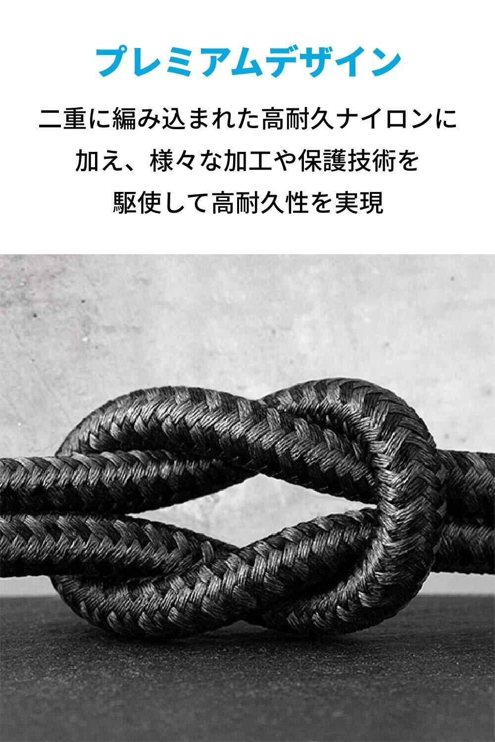 高耐久ナイロン素材を使用しており、しなやかでありながら、優れた耐久性を発揮します。ケーブルの折れ曲げに約30,000回耐えられるため、長期間安心してご使用いただけます。