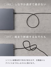 【しなやか過ぎて絡まない、折り曲げテスト30,000回クリアのシリコンケーブル】外装にシリコン素材を使用したことで、従来のケーブルにはない柔らかい質感を実現しました。優しい使い心地をご体感ください。カバンやポケットに入れても絡みにくく、出し入れもスムーズに行えます。折り癖や巻き癖が付きにくいため、いつでもストレスフリーにご使用いただけます。30,000回の折り曲げテストを実施し、断線しにくい優れた耐久性を実現。ケーブル内部のワイヤーを断線から保護し、安心して急速/高速充電することが出来ます。