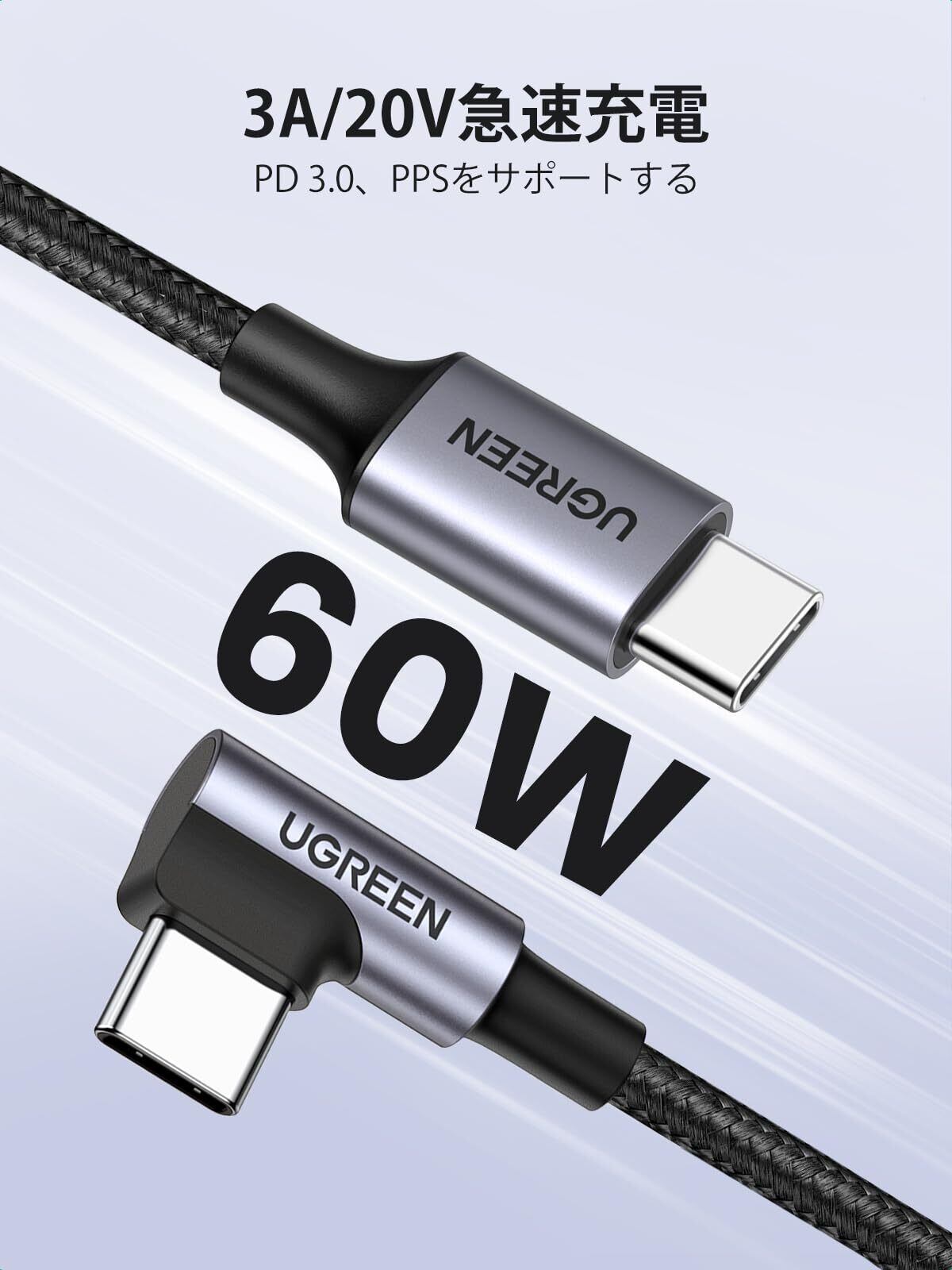 UGREEN USB C ケーブル L字 Type-c L型 PD 60W/3A 急速充電 断線防止 ナイロン編み アンドロイド スマホ iphone17/16/15シリーズ/MacBook/iPad/Galaxy S24/Pixel/Google/HP/Switch等USB-Cデバイス対応-1M【ビデオ出力非対応】