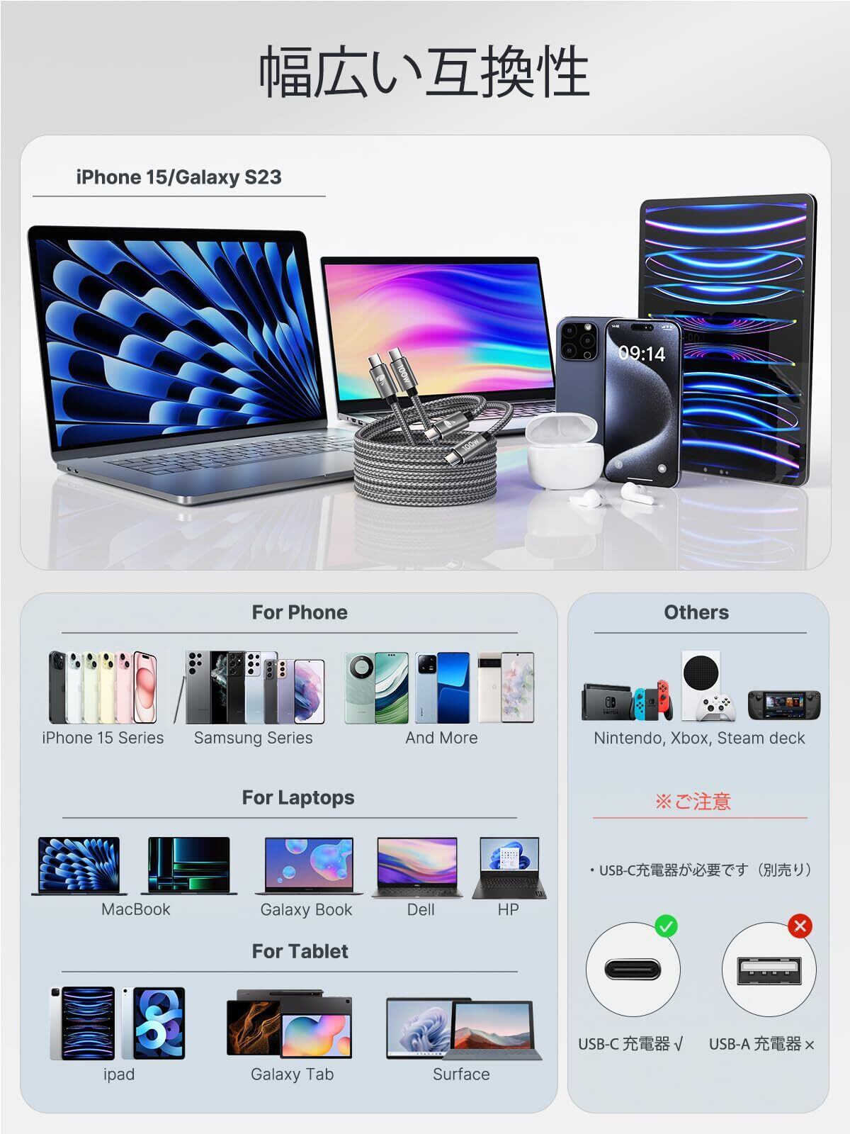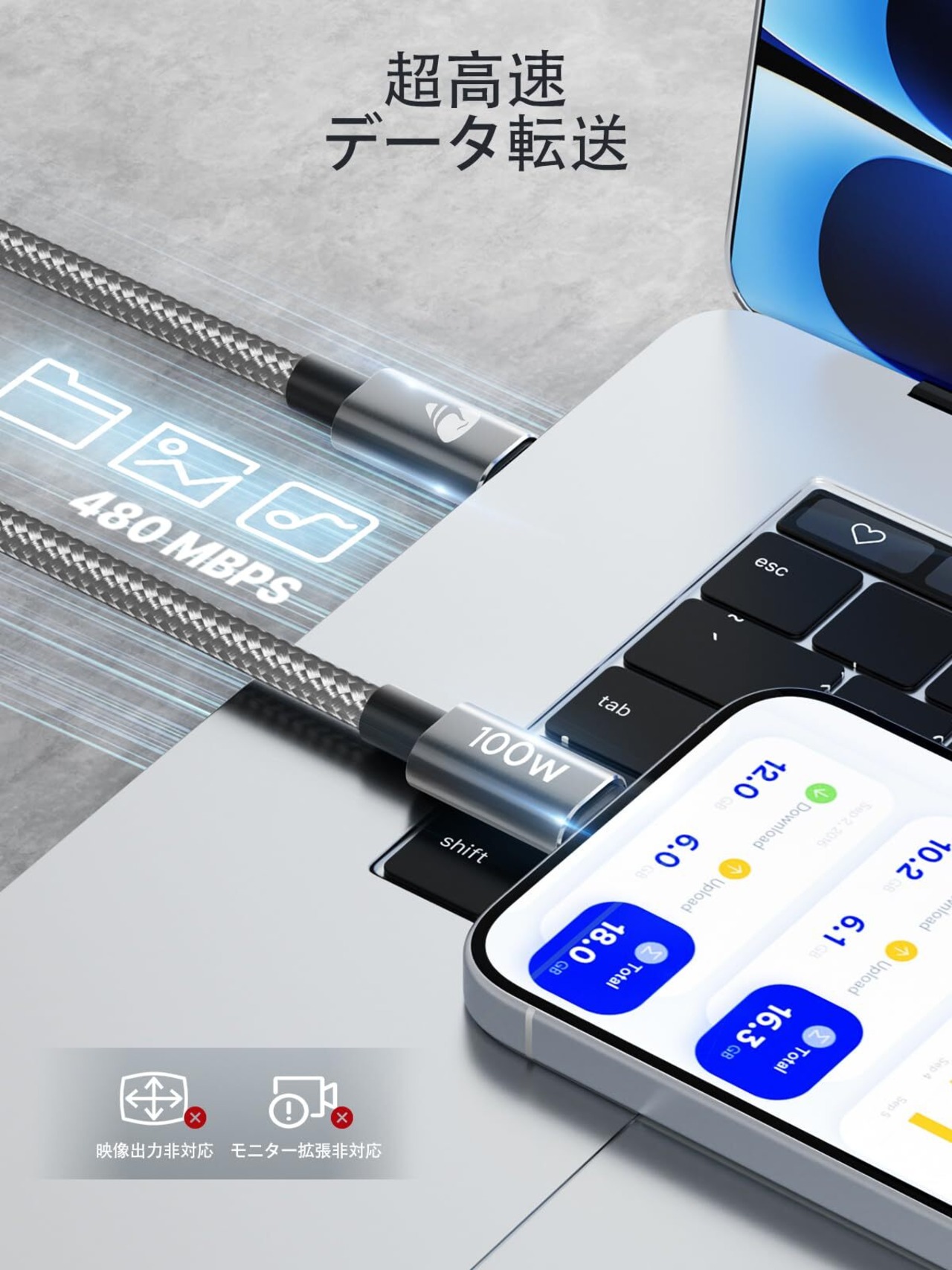 このUSB C ケーブルは、最大100W(5A)のPower Delivery(PD)に対応しており、急速充電を実現します。iPhone 16/15 Pro MaxやSamsung Galaxy S25/S24、Google Pixel、MacBook Pro/Air、Switch、PS5など、さまざまなUSB-Cデバイスに最適です。