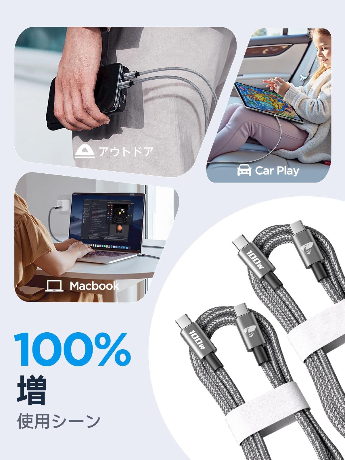 USB C ケーブル【2M/2本 PD対応 100W/5A 超急速充電】USB タイプc 断線防止 高速データ転送 ナイロン編み USBC to USBC 充電ケーブル iPhone 16 15 Pro Max Samsung Galaxy S25 S24 Google Pixel MacBook Pro Air iPad Xperia Switch PS5等Type C各種対応(グレー)