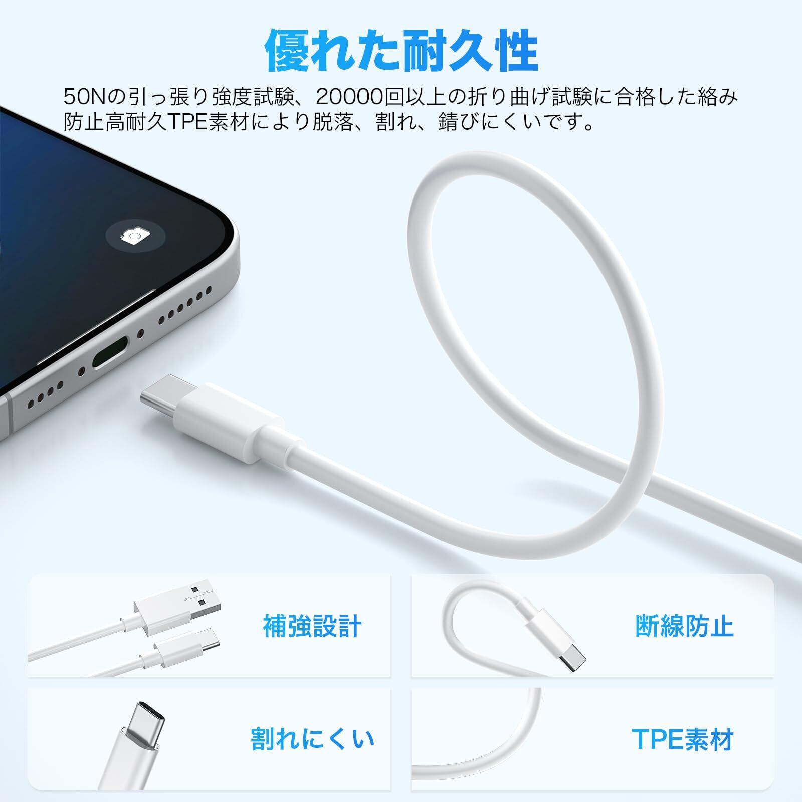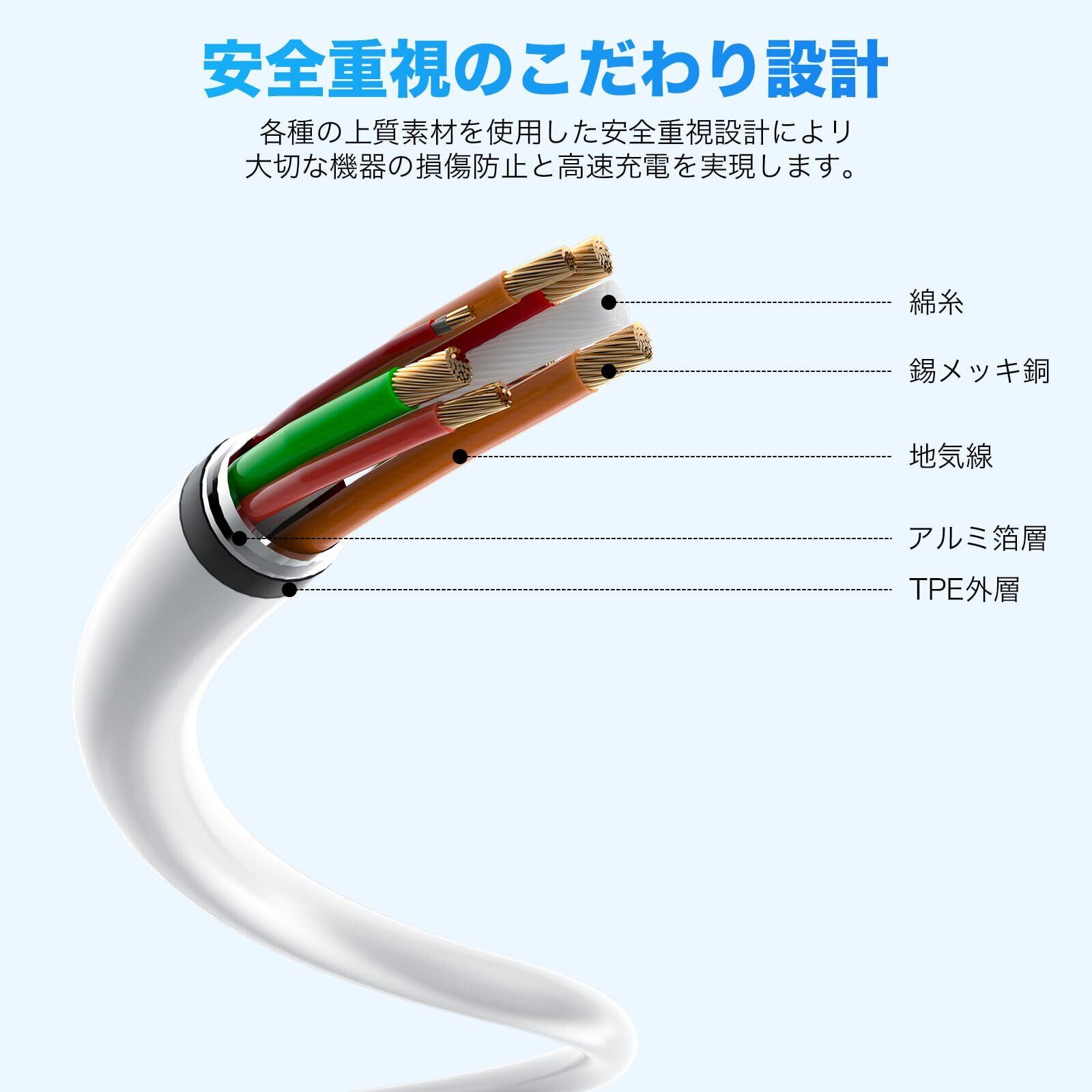 【優れた耐久性】:Type-C ケーブル20000回以上の折り曲げ試験をクリアし、内部の無酸素銅、アルミ箔なども劣化しづらく耐磨耗性に優れています、外部はTPE素材によって覆われ、断線しにくい、絡みにくい、取り回しやすいです。コネクタ部はアルミニウム合金に金メッキされており、割れ、錆びに対し、強度が極限まで高められたケーブルです。
