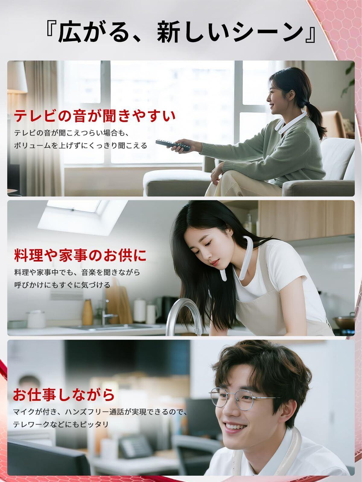 【まるで空気のように軽やか! たったの88g、驚異の装着感】「重い」「首が疲れる」は、もう過去の話。業界トップクラスの軽さ88gを実現しました。まるで無重力のように肩にのせれば、その軽さに驚くはず。一日中つけていても、その存在さえ忘れてしまうほど。首や肩への負担を最小限に抑え、あなたの動きを妨げません。【耳を塞がないから、快適で安全! "ながら聴き"の最適解】イヤホンやヘッドセットのような耳への圧迫感・蒸れ・かゆみは一切ナシ!開放型設計だから、周囲の音や大切な呼び声もクリアに聴こえます。家事をしながら、育児をしながら、ジョギングをしながら…。音楽を楽しみつつ、生活やコミュニケーションもスムーズに。Bluetooth接続で最大10mの自由な動きとIPX5防水で、キッチンでも運動中でも、思いのままに。