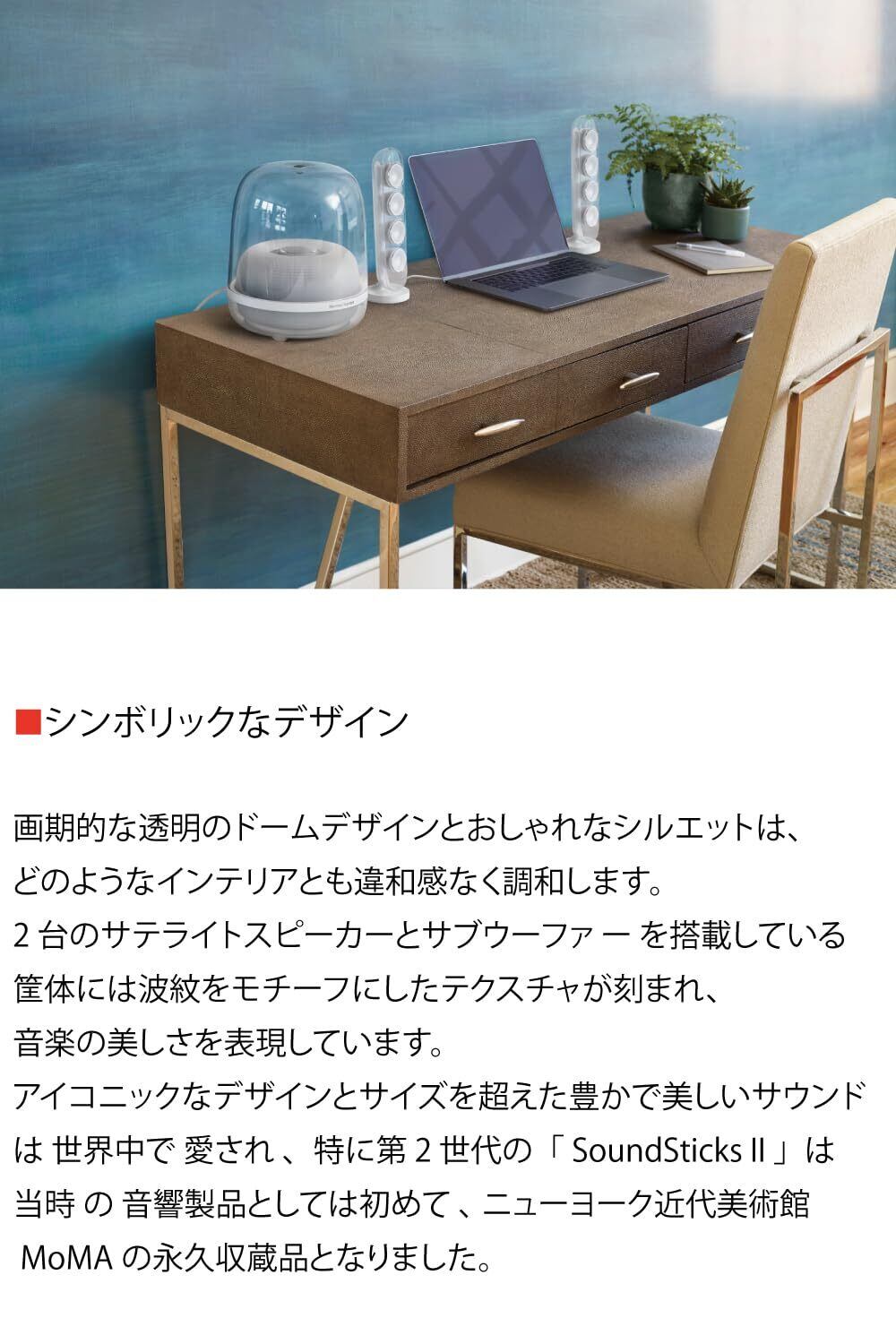 SoundSticks 4は、その印象的な外観と洗練されたサウンドが魅力のスピーカーです。優れたオーディオ体験を実現し、音楽鑑賞や映画視聴の際に特別な雰囲気を演出します。