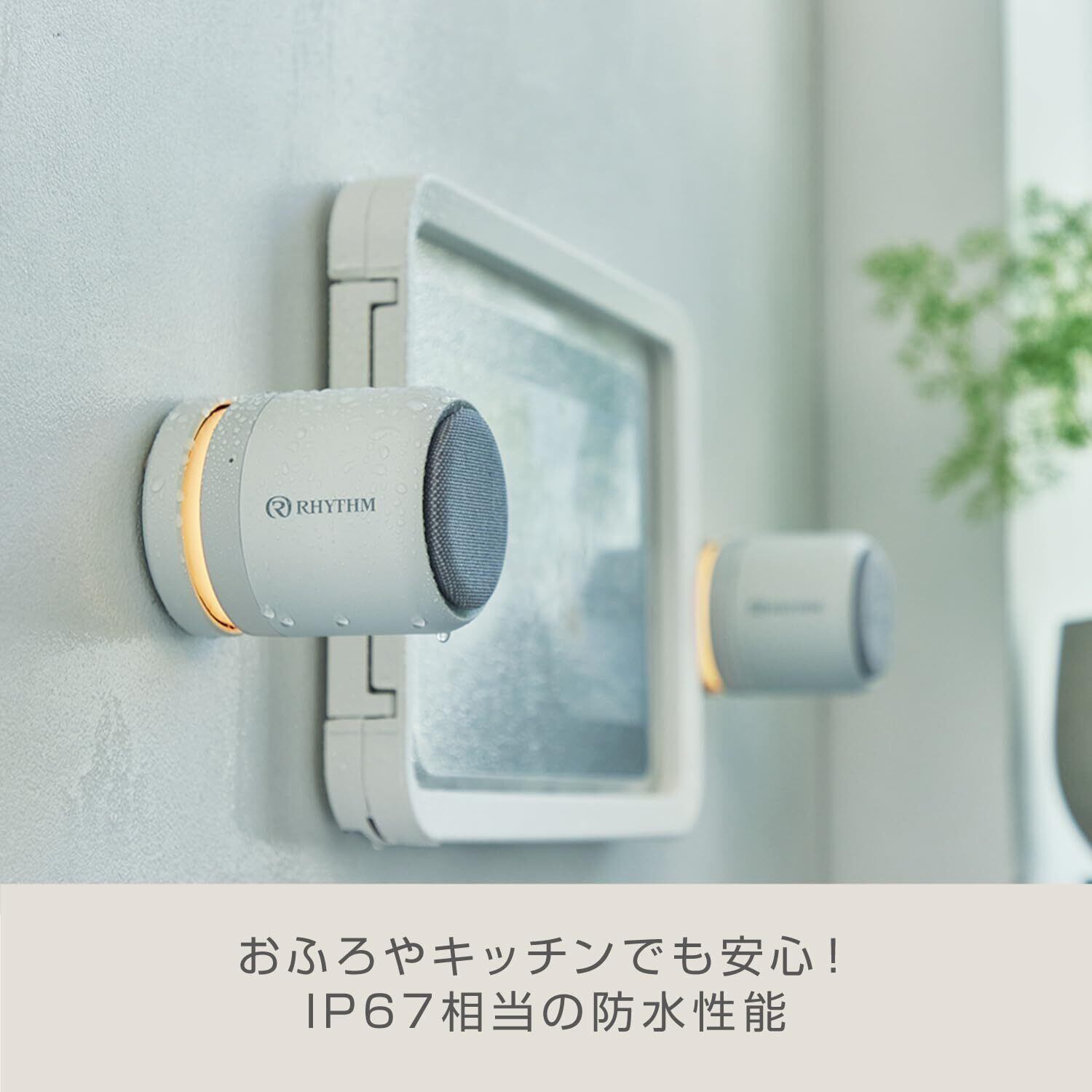 【安心の防水・防塵性能】おふろやキッチン、アウトドアでも安心してお楽しみいただけるよう、IP67相当の防塵・防水性能を実現しました。※JIS保護等級 IP67相当:水深1mの真水に30分間浸しても有害な影響を受けません。(防浸形)※スピーカーを設置する面の水滴を拭き取ってからご使用ください。